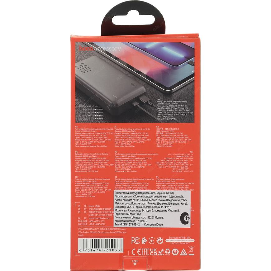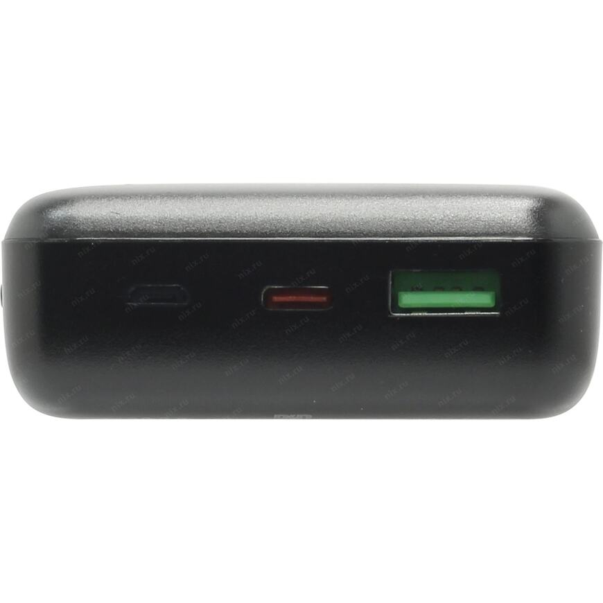 Внешний аккумулятор (пауэрбанк) оснащен портом USB Type A и USB Type C входом/выходом для быстрой подзарядки QC3.0 совместимых мобильных устройств, включая смартфоны, планшеты, плееры и другие устройства с питанием от USB-порта (5 В и до 3 А). Отличительной особенностью данного аккумулятора является наличие двух входных портов для зарядки (USB Type C и USB micro B). То есть, сам Power Bank можно подзарядить от блока питания для Mac Book или от USB порта компьютера - на выбор (но не одновременно)