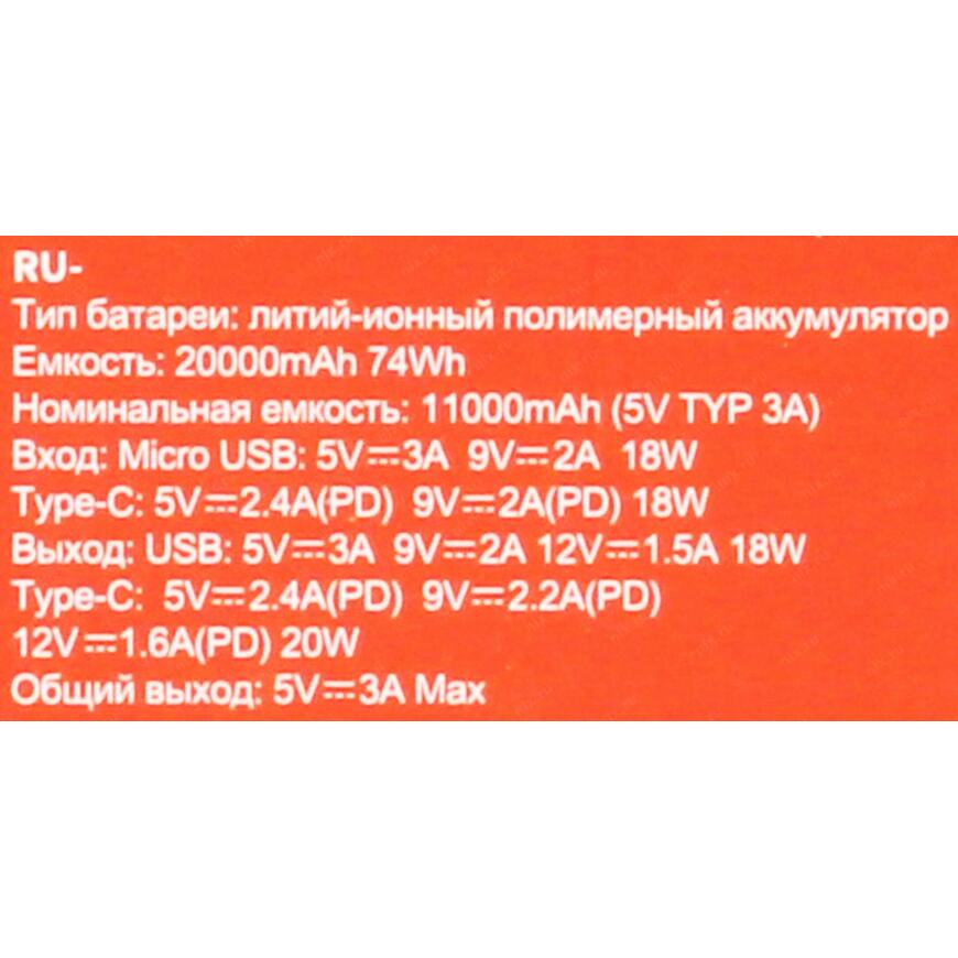20000 мАч (заявленная производителем ёмкость внутреннего аккумулятора Power Bank; реальная отдаваемая ёмкость Power Bank в пересчете на напряжение 5 В при 3 А составляет 11000 А)