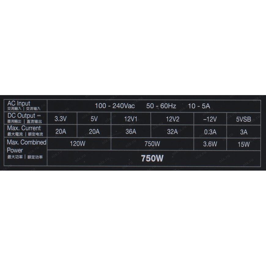 | Максимальная нагрузка | +3.3V - 20A, +5V - 20A, +12V1 - 36A, +12V2 - 32A,+5VSB - 3A, -12V - 0.5A; Комбинированная нагрузка: +3.3V & +5V - 120 Вт, 12V - 750 Вт; |