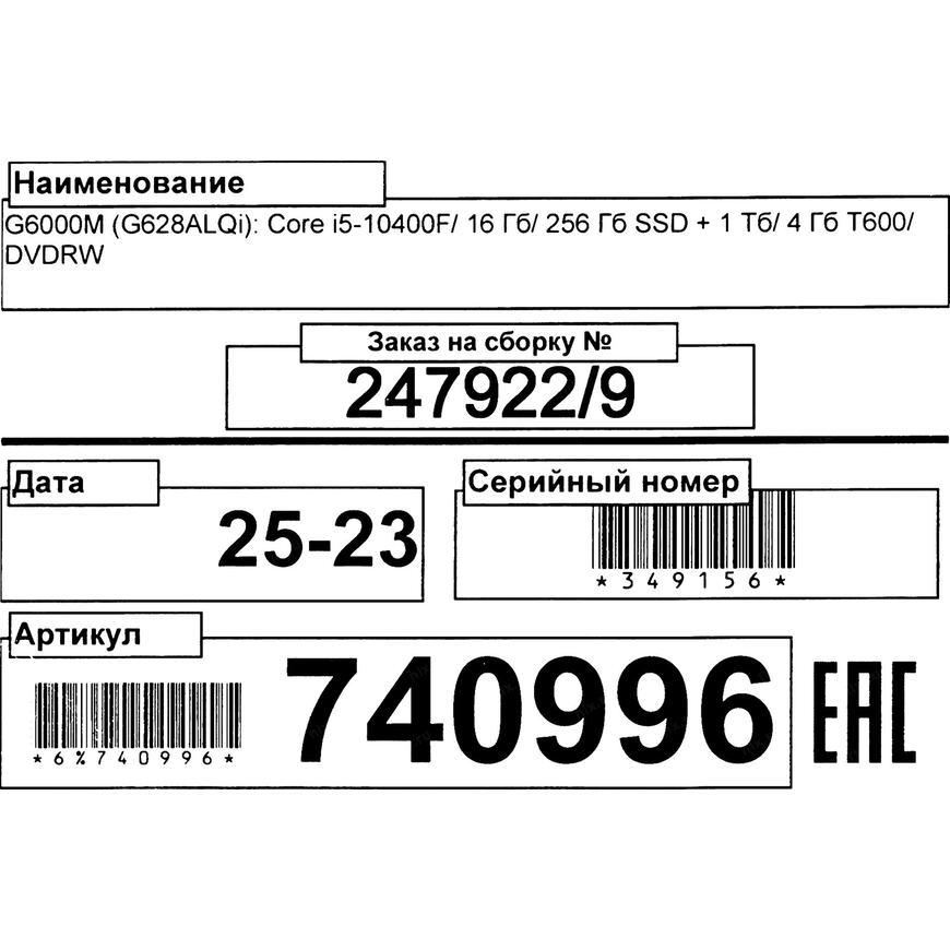 | Процессор компьютера | Intel Core i5 10400F (2.9 - 4.3 ГГц, 6 ядер, 65 Вт) |
