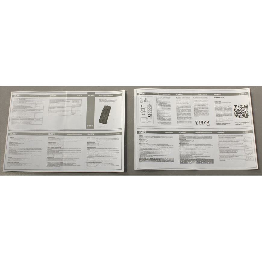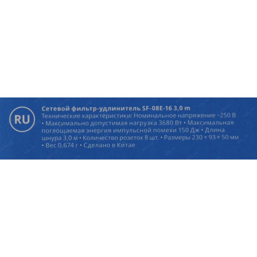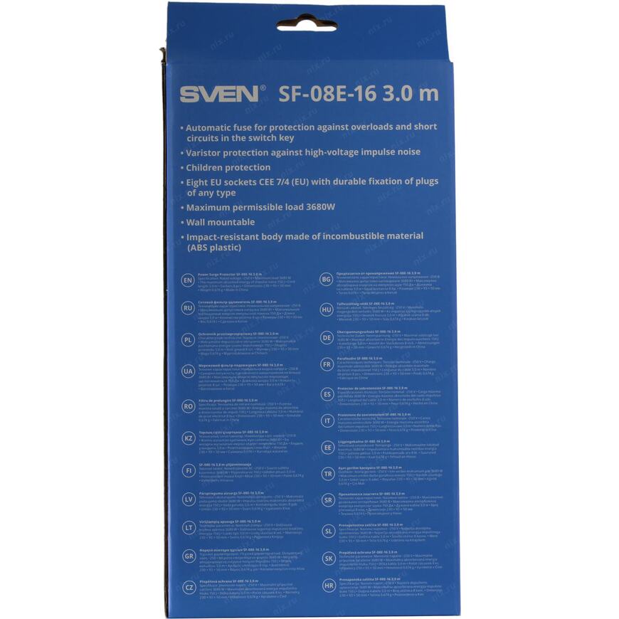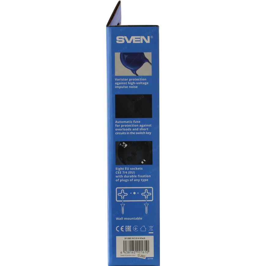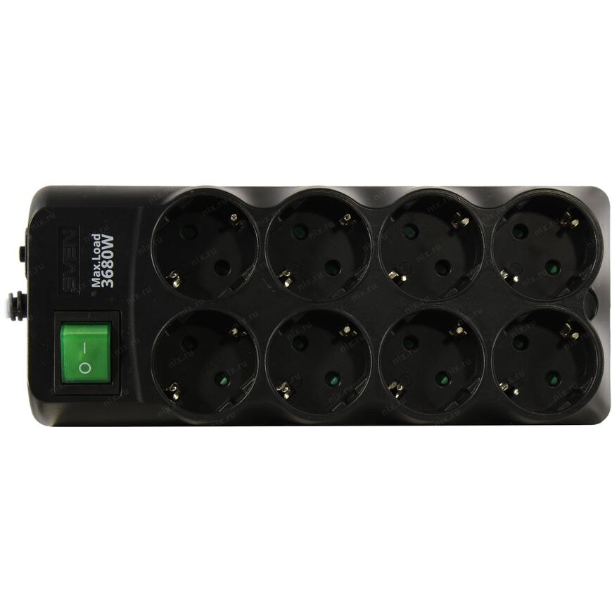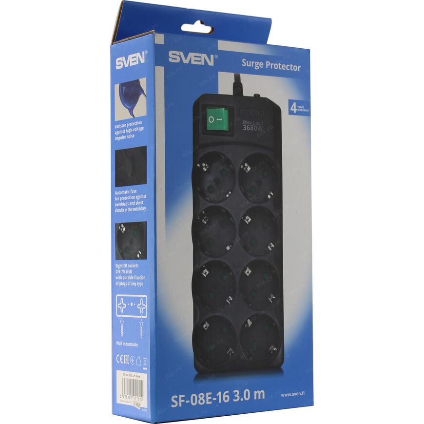 Сетевой фильтр 3.68 кВт SVEN SF-08E-16 3м Black 8 розеток евростандарт с заземлением 3 метра