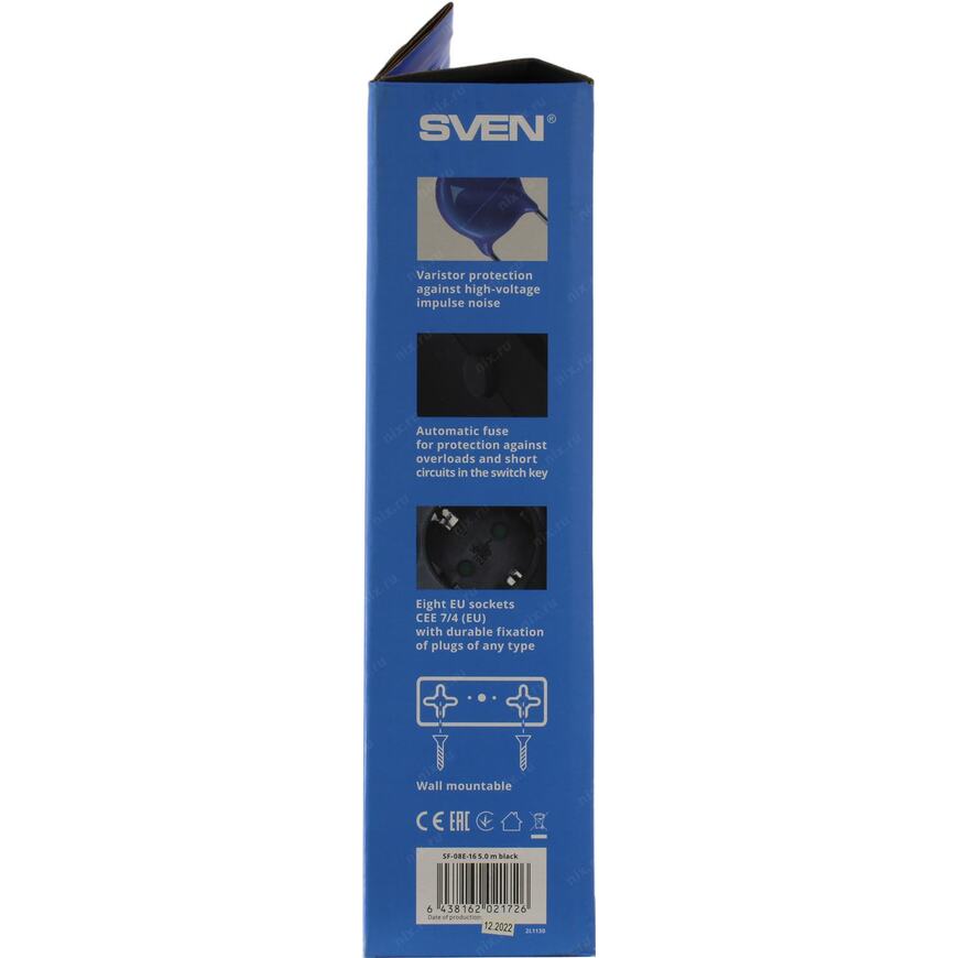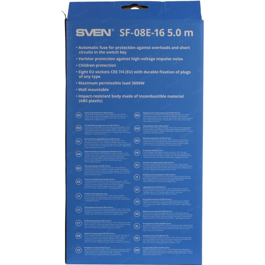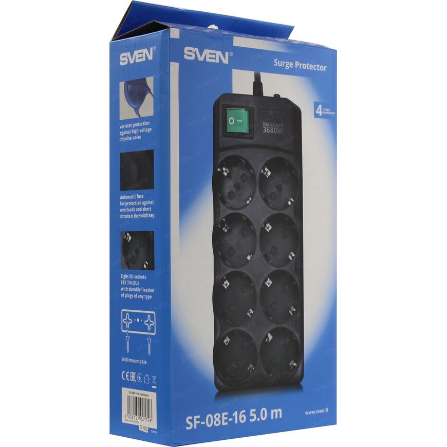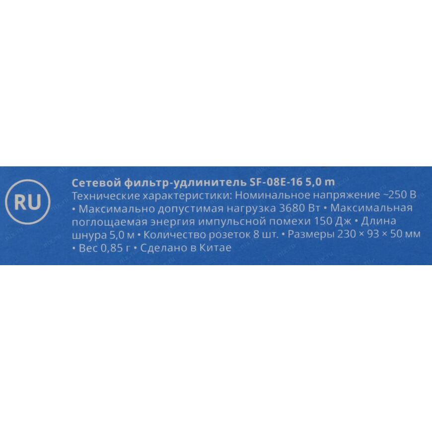 Сетевой фильтр 3.68 кВт SVEN SF-08E-16 5м Black 8 розеток евростандарт с заземлением 5 метров