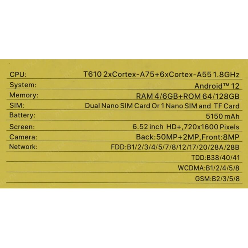 | Модель процессора смартфона | UNISOC Tiger T610 |