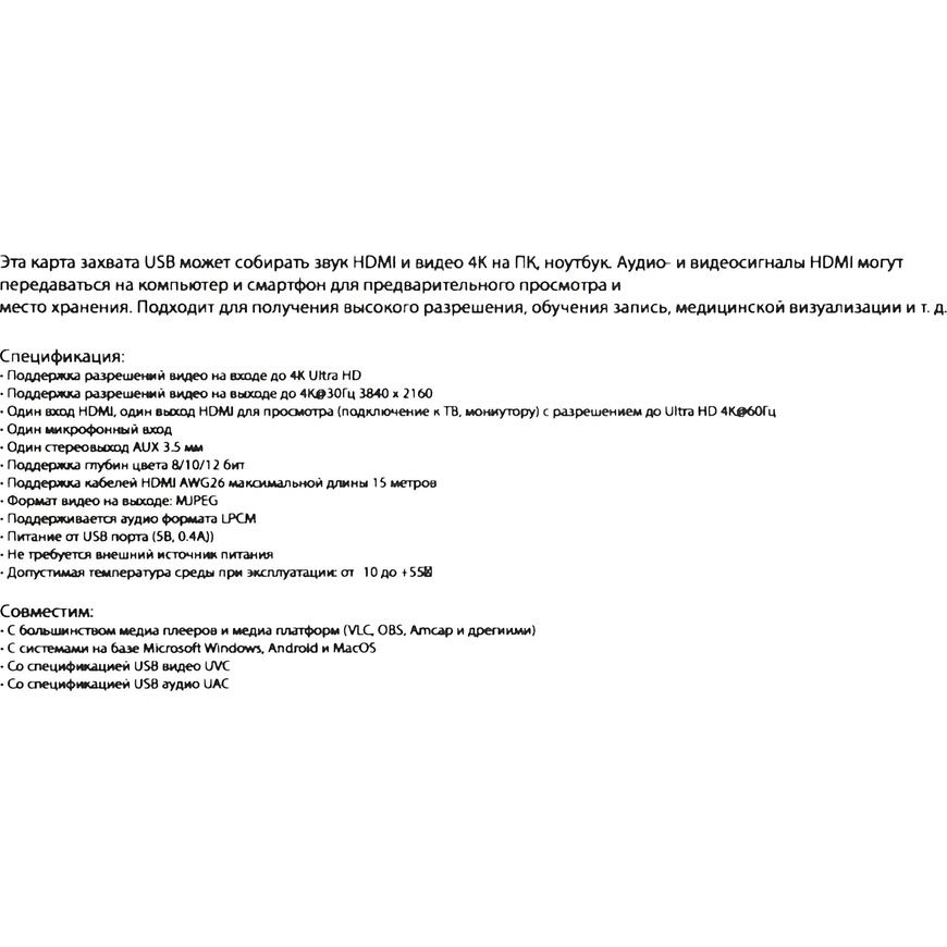 | Совместимость | С большинством медиа плееров и медиа платформ (VLC, OBS, Amcap и другими) С системами на базе Microsoft Windows, Android и MacOS Со спецификацией USB видео UVC Со спецификацией USB аудио UAC |