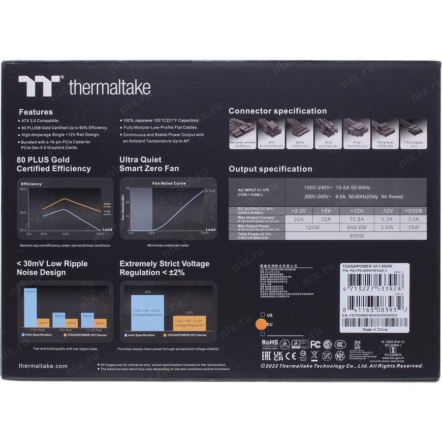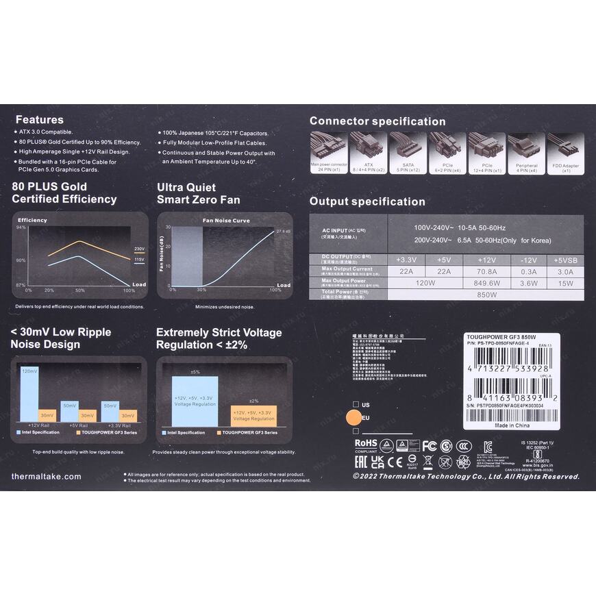 +3.3V - 22 А, +5V - 22 А, +5Vsb - 3 А, +12V1 - 70.8 А, -12V - 0.3 А, Суммарно по линиям 12V -849.6 Вт