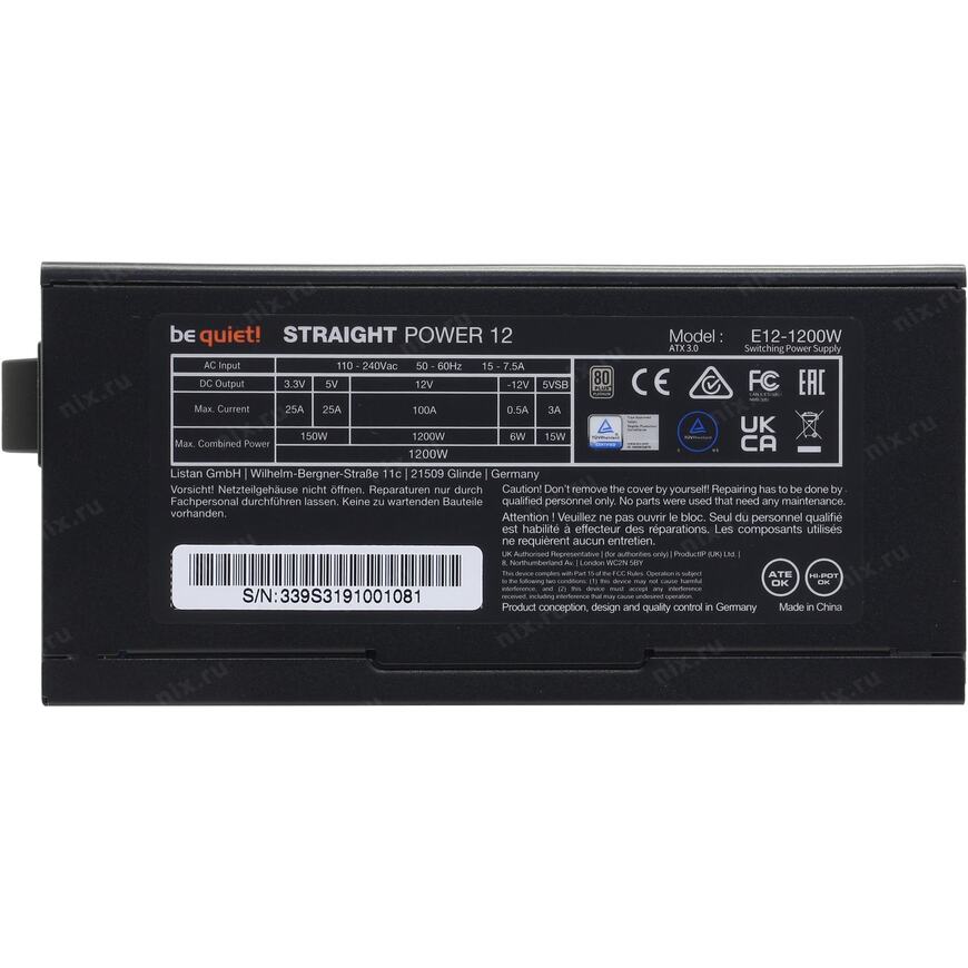 | Максимальная нагрузка | +3.3V - 25A, +5V - 25A, +12V -100A, +5VSB - 3A, -12V - 0.5A; Комбинированная нагрузка: +3.3V & +5V - 150 Вт |
