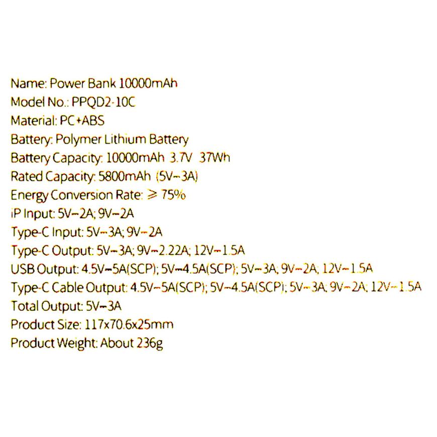| Емкость аккумулятора | 10000 мАч (заявленная производителем ёмкость внутреннего аккумулятора Power Bank; реальная отдаваемая ёмкость Power Bank в пересчете на напряжение 5 В может отличаться в меньшую сторону) |