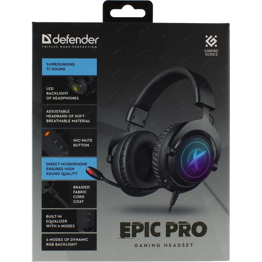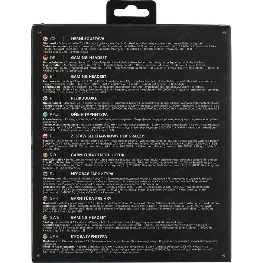 Игровая гарнитура премиум-класса с виртуальным объемным звуком 7.1, встроенным эквалайзером и 4 режимами динамической RGB-подсветки.