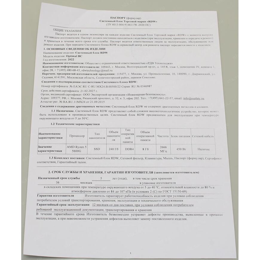 | Процессор компьютера | AMD Ryzen 5 5600G (3.9 - 4.4 ГГц, 6 ядер, 65 Вт) |