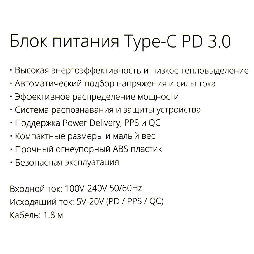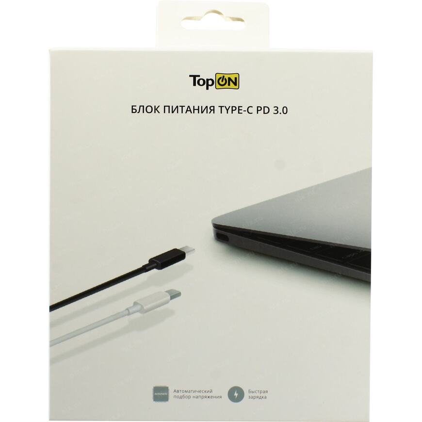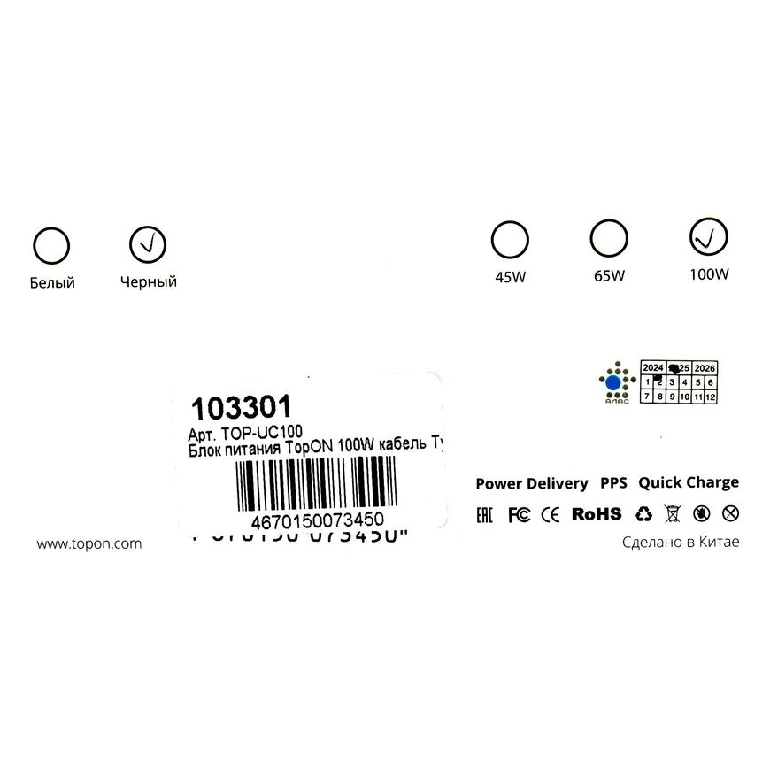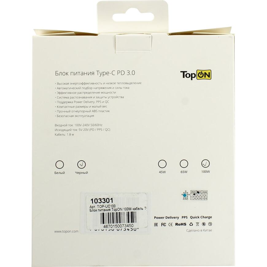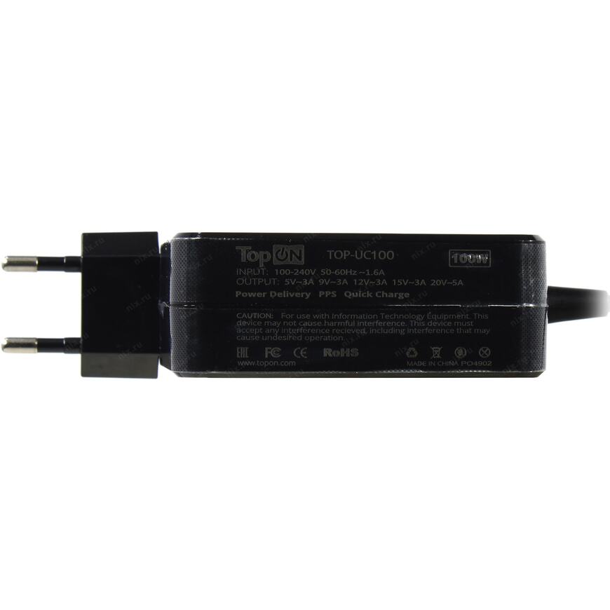 Универсальный блок питания TopON TOP-UC100 100W c кабелем Type-C, PowerDelivery 3.0 и PPS, в розетку. Автоматический подбор напряжения и силы тока. Стабилизация напряжения и защита от помех. Кабель устойчивый к высоким температурам по стандарту CSA FT1. Прочный огнеупорный ABS пластик.
