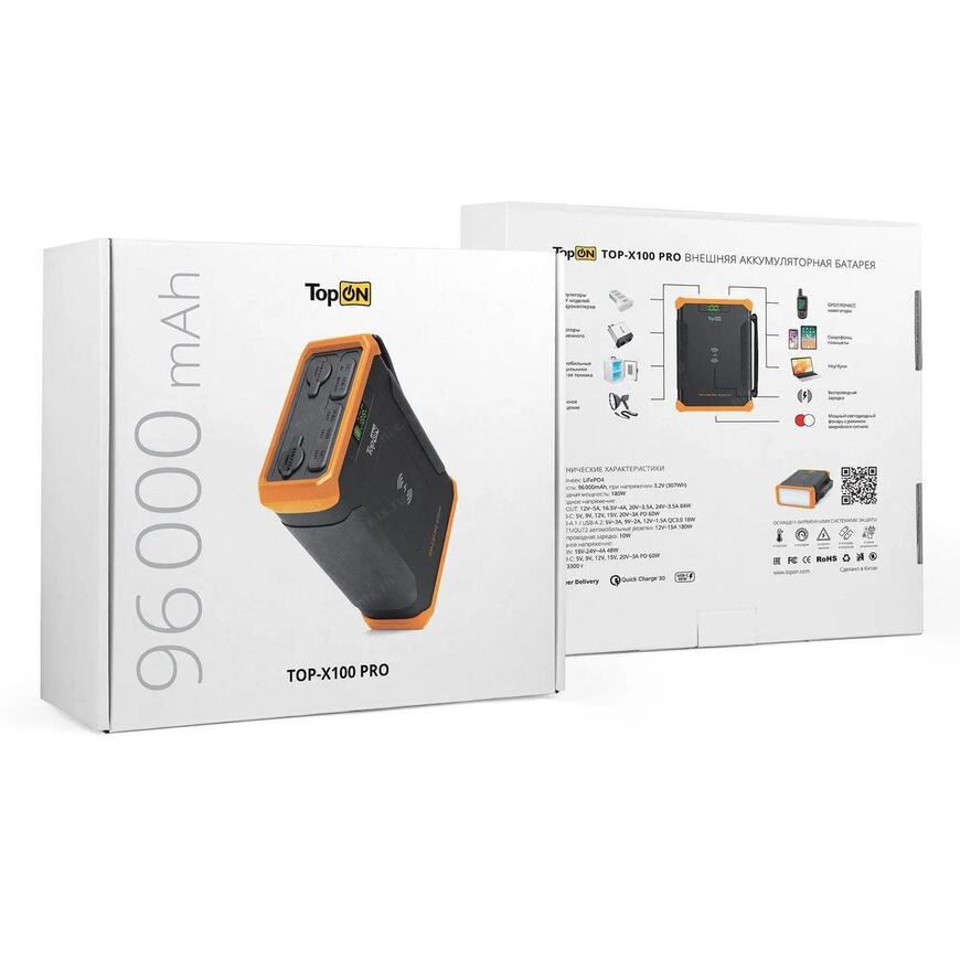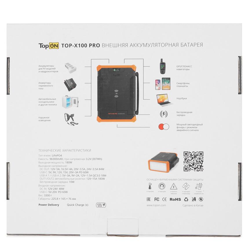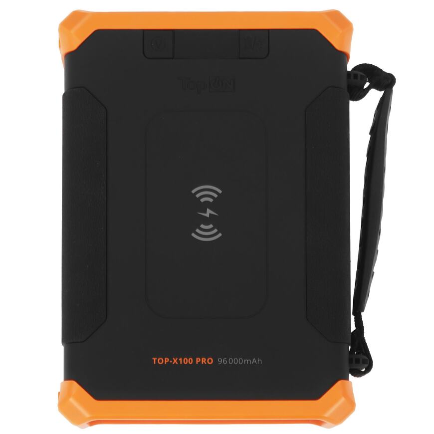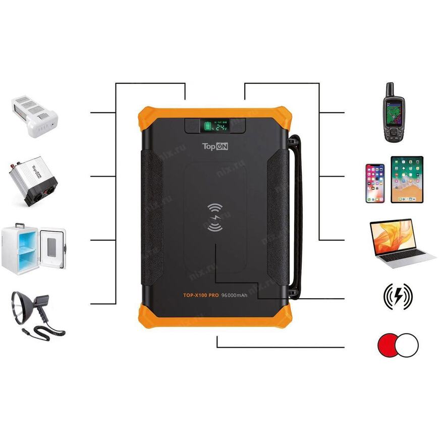 TOP-X100 PRO имеет DC порт 84W с широким диапазоном выходных напряжений, 2 автомобильные розетки 180W, порт USB Type-C PD 60W, 2 дополнительных USB 18W QC3.0 и модуль беспроводной зарядки Qi 10W, что обеспечивает поддержку питания автомобильных холодильников, пылесосов и термосов, электрических насосов, портативных вентиляторов, наружного освещения и освещения для охоты и рыбалки, GPS-навигаторов, раций и металлоискателей, ноутбуков, планшетов, смартфонов, электронных книг, аккумуляторов для РУ-моделей, квадрокоптеров, дронов, электроинструмента, фото/видео камер и другой техники.