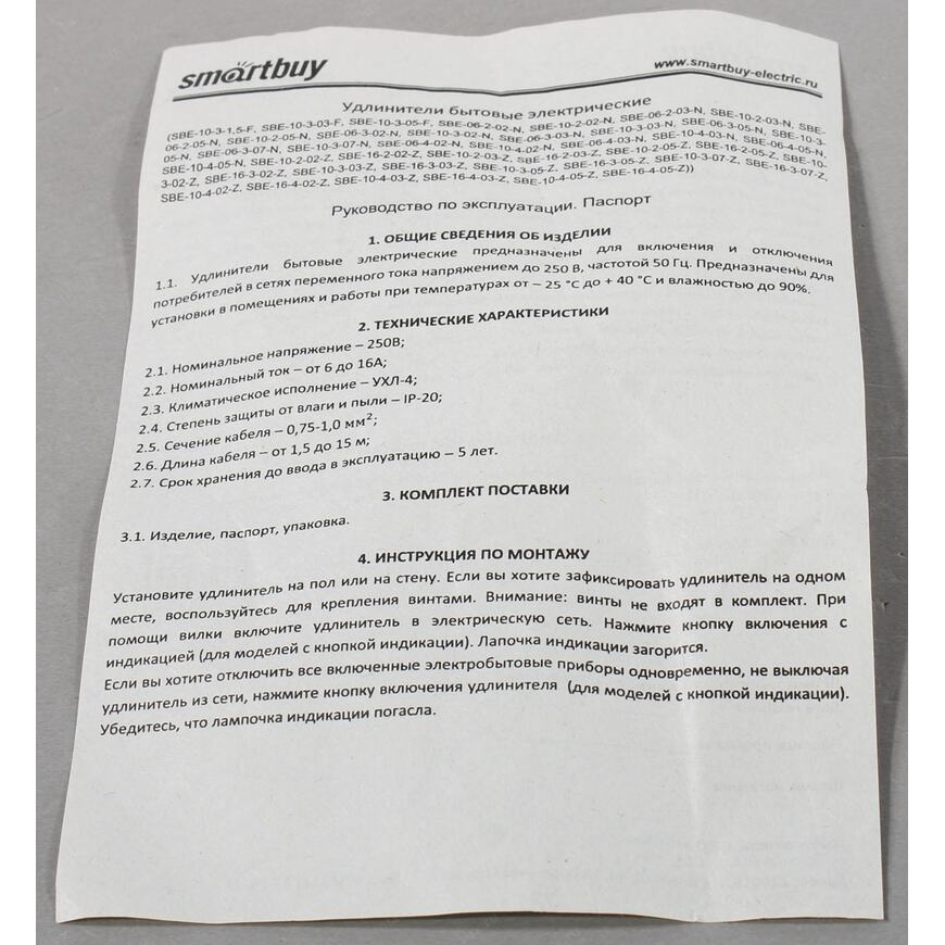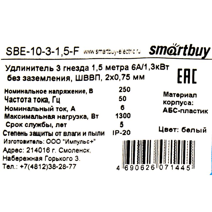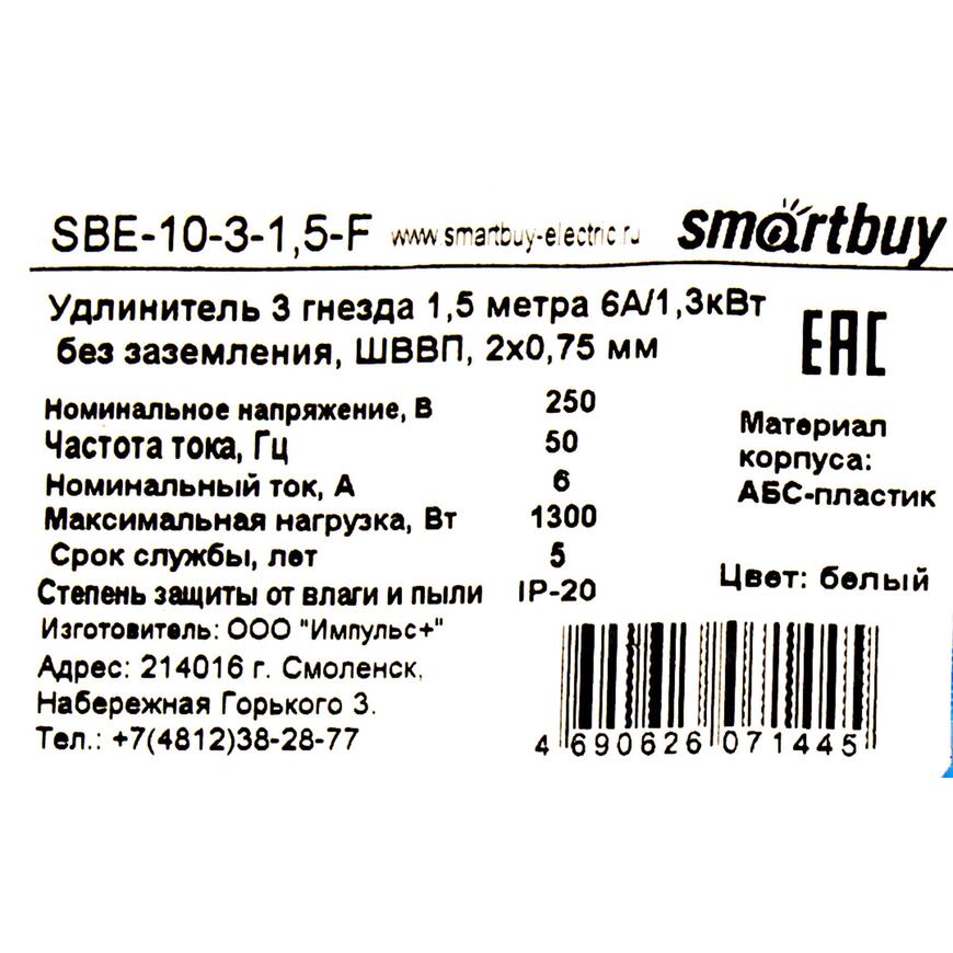 Удлинитель SmartBuy SBE-10-3-05-F, 3 розетки без заземляющих контактов 1.5 метра Белый