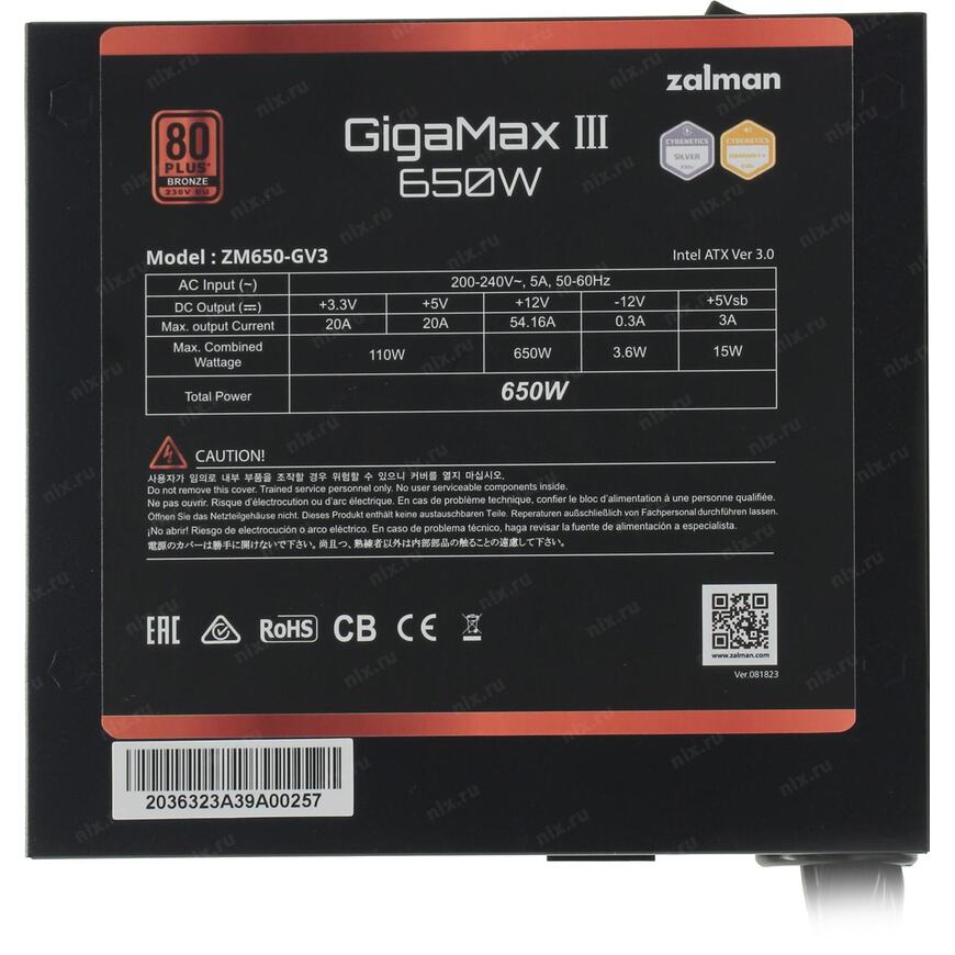 +3.3V - 20A, +5V - 20A, +12V - 54.16A, +5VSB - 3.0A, -12V - 0.5A; Комбинированная нагрузка: +3.3V&+5V - 130 Вт