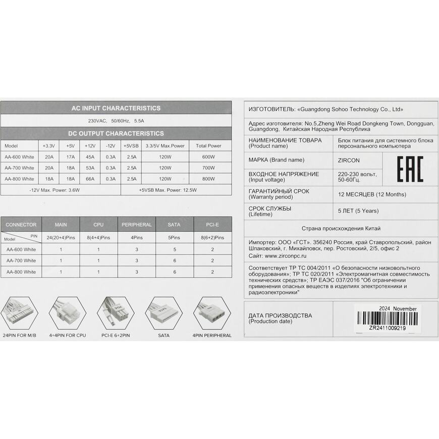 +3.3V - 20A, +5V - 17A, +12V - 45A, +5VSB - 2.5A, -12V - 0.3A; Комбинированная нагрузка: +3.3V&+5V - 120 Вт