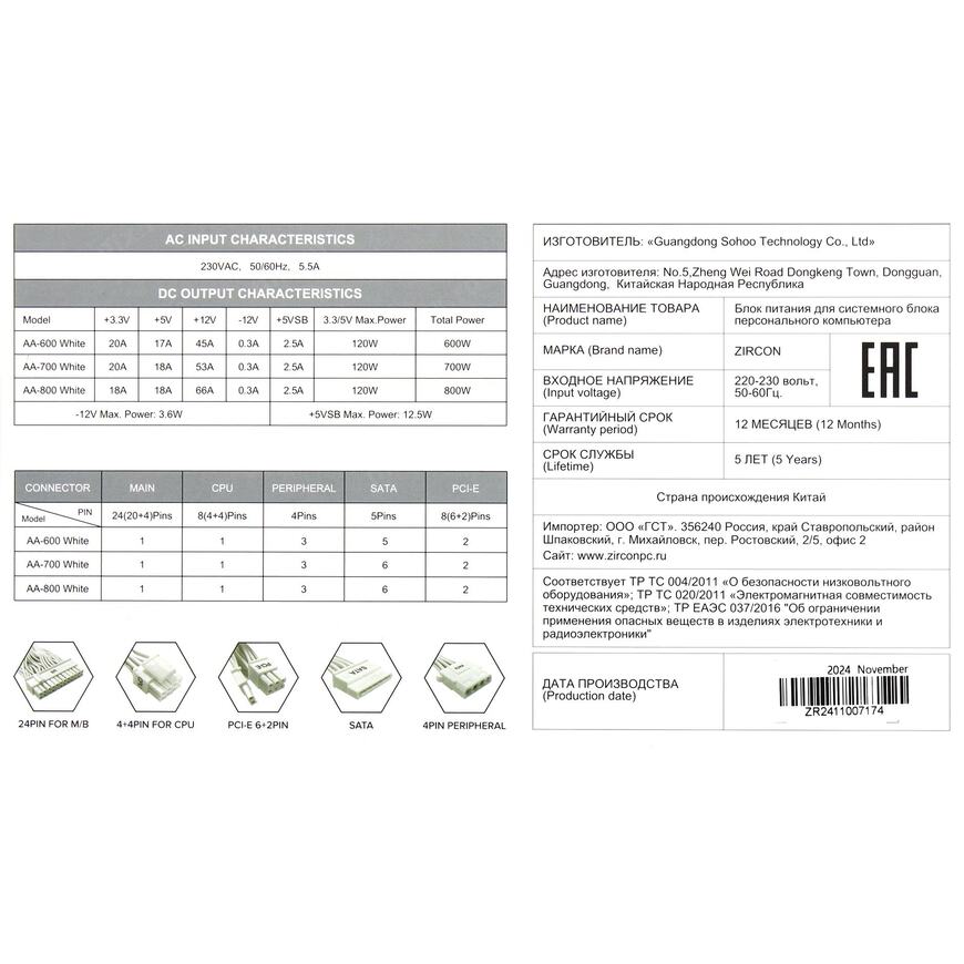 24+8 pin, 24+4 pin, 20+4 pin (разборный 24-pin коннектор. 4-pin могут отстегиваться в случае необходимости, разборный 8-pin коннектор)