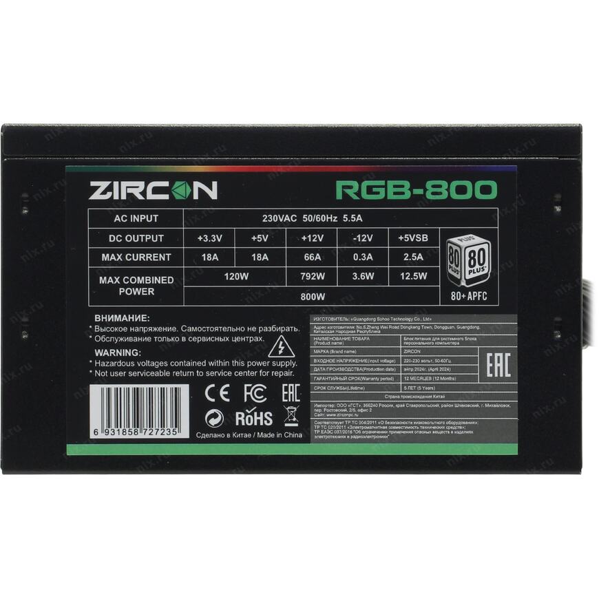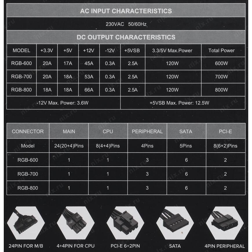+3.3V - 18A, +5V - 18A, +12V - 66A, +5VSB - 2.5A, -12V - 0.3A; Комбинированная нагрузка: +3.3V&+5V - 120 Вт