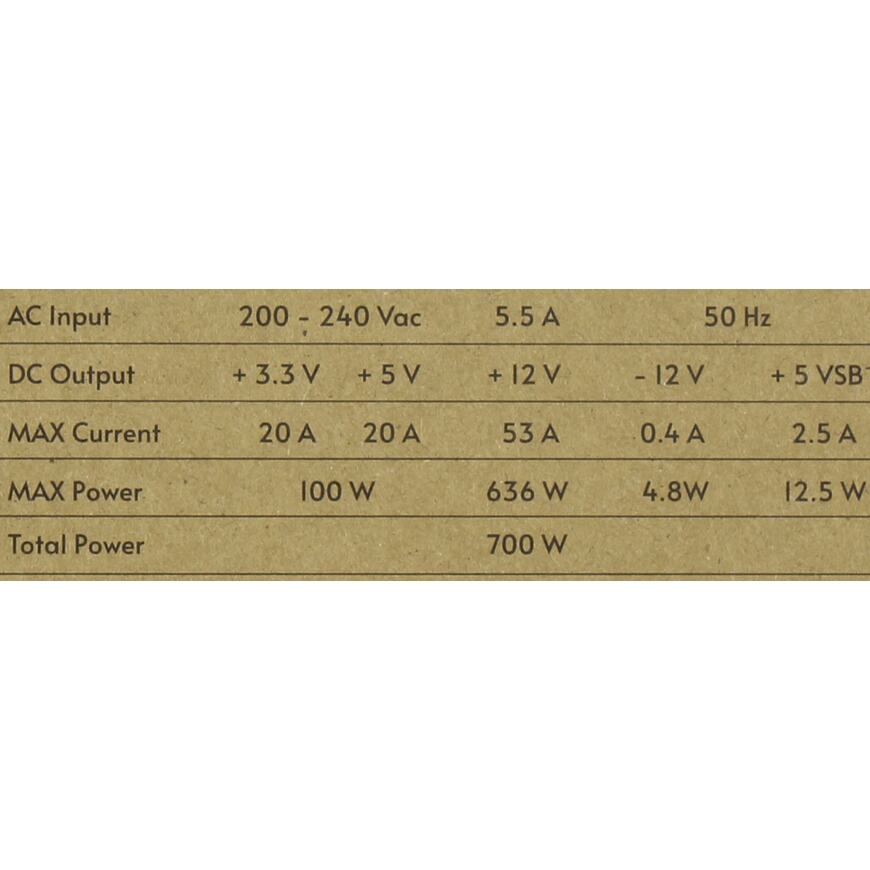 +3.3V - 20A, +5V - 20A, +12V - 53A, +5VSB - 2.5A, -12V - 0.4A