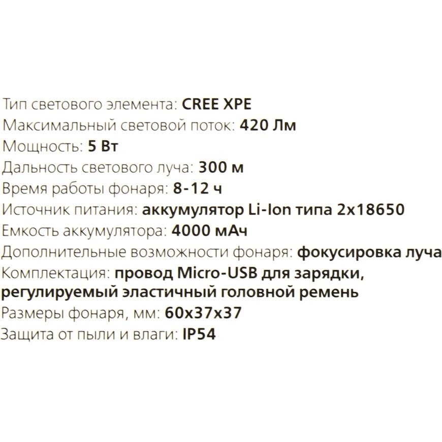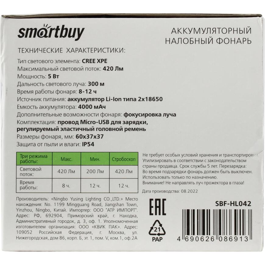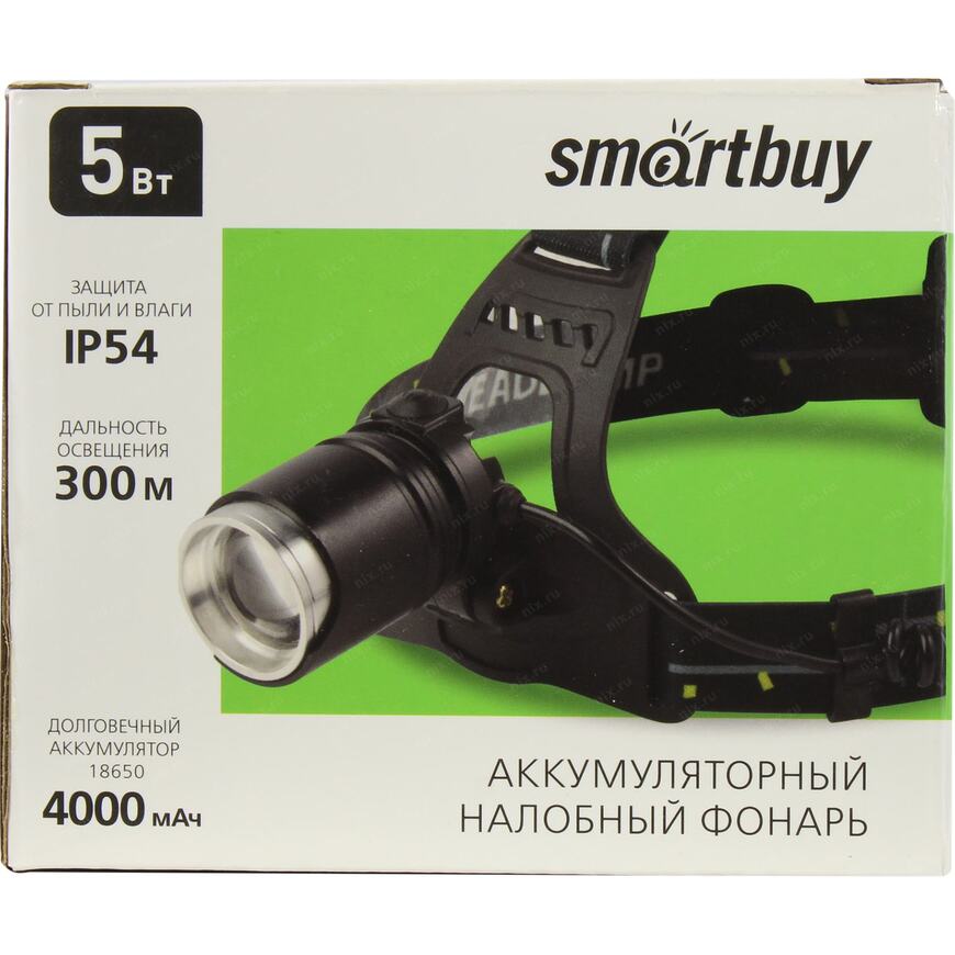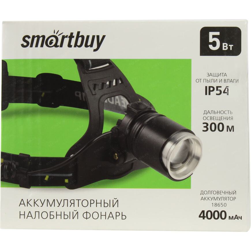 | smartbuy_тхп_краткое описание | "Материал: металл и пластик; Максимальный световой поток: 420 Лм; Мощность: 5 Вт; Дальность освещения: 300 м; Три режима работы: дальний свет, ближний свет, стробоскоп; Источник питания: аккумулятор Li-Ion типа 2x18650, 4000 мАч; Дополнительные возможности фонаря: фокусировка луча; Комплектация: провод Micro-USB для зарядки, регулируемый эластичный головной ремень; Упаковка: цветная картонная коробка" |