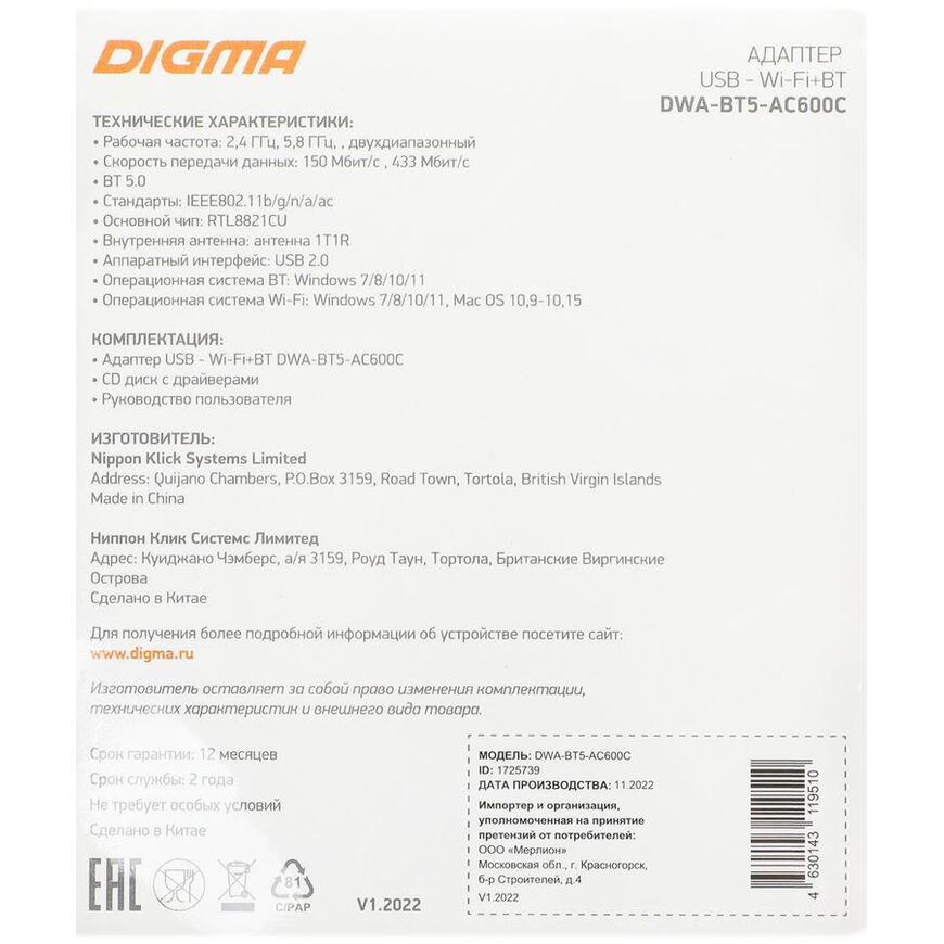 Адаптер WiFi + Bluetooth Digma DWA-BT5-AC600C