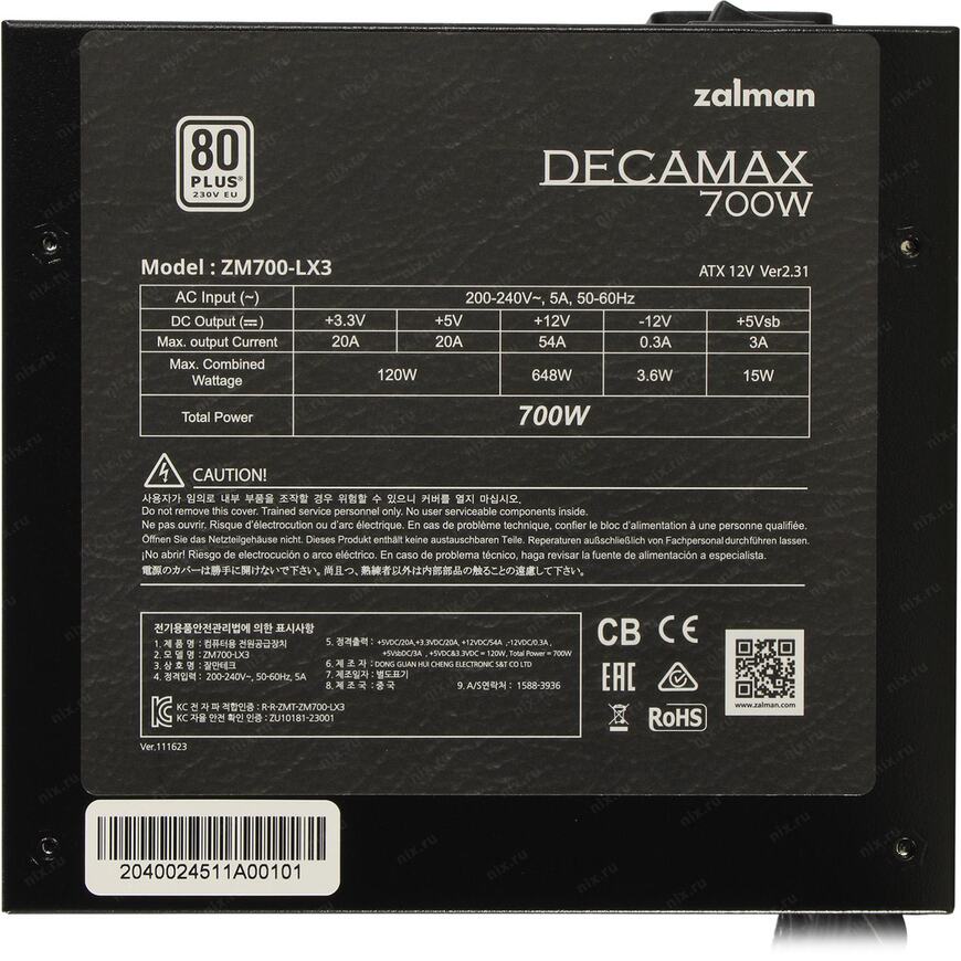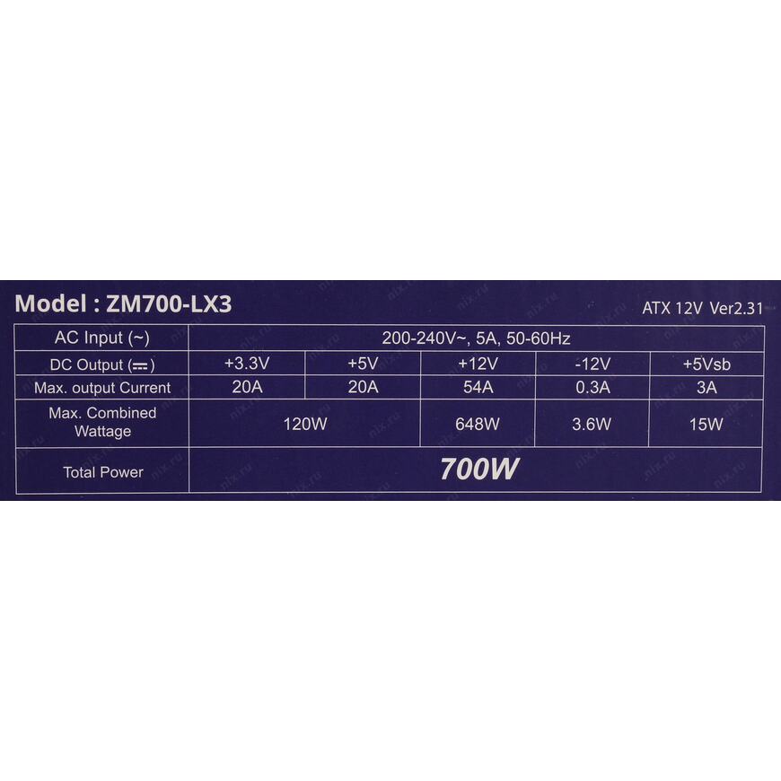 +3.3V - 20A, +5V - 20A, +12V - 54A, +5VSB - 3.0A, -12V - 0.3A; Комбинированная нагрузка: +3.3V & +5V 120 Вт