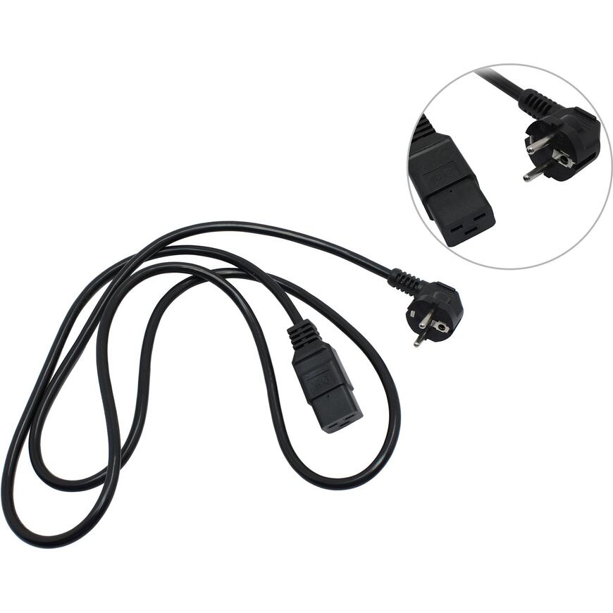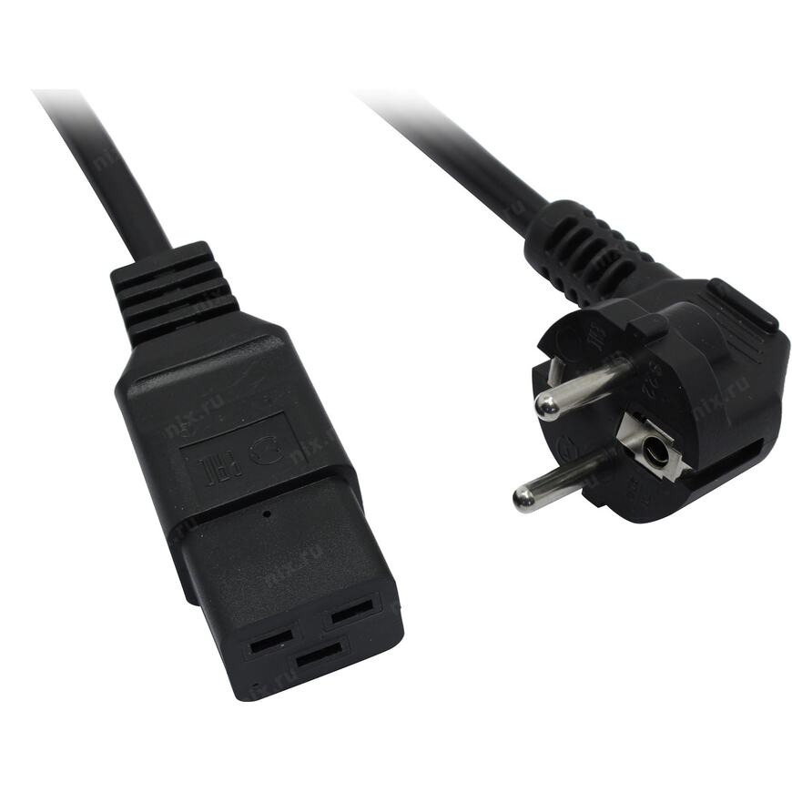 Шнур (кабель) выполнен из ПВХ черного цвета, имеет опрессованную розетку IEC 60320 C19 и вилку Schuko. Кабель состоит из трех многожильных проводов сечением 1.5 мм2, имеет заземление. Номинальный ток нагрузки: 16А. Номинально напряжение: 220-250 В. Длина кабеля 1.8 метра.