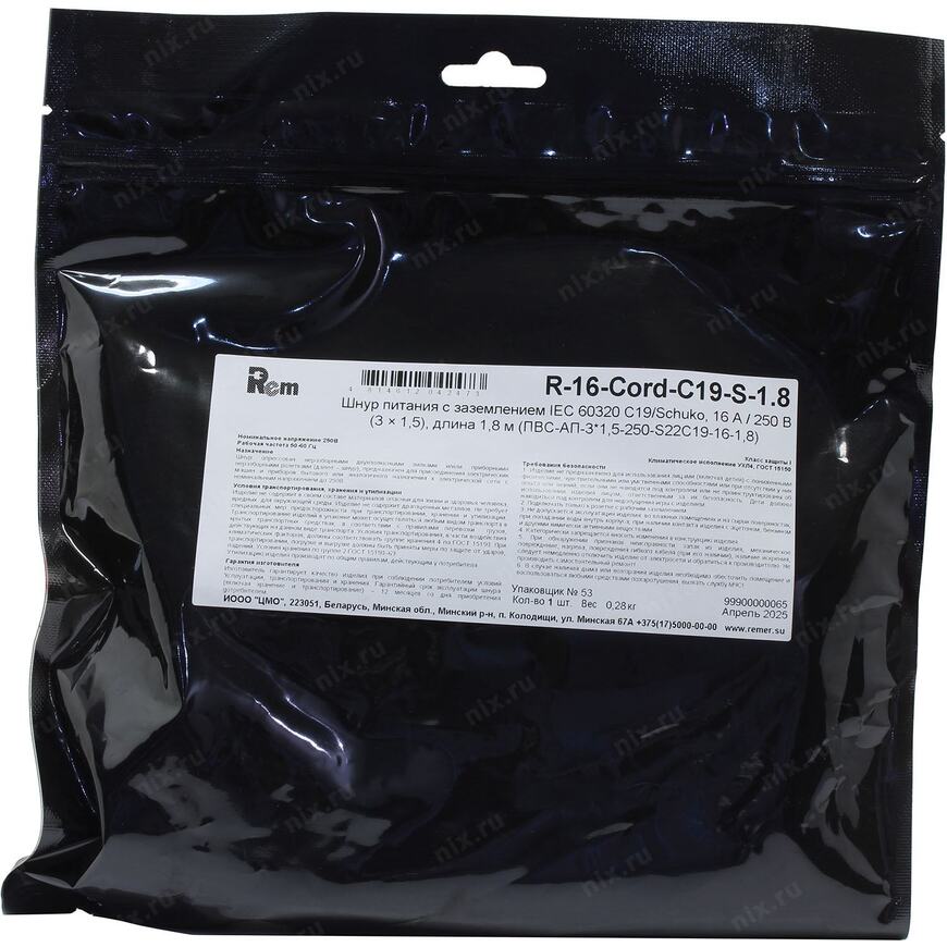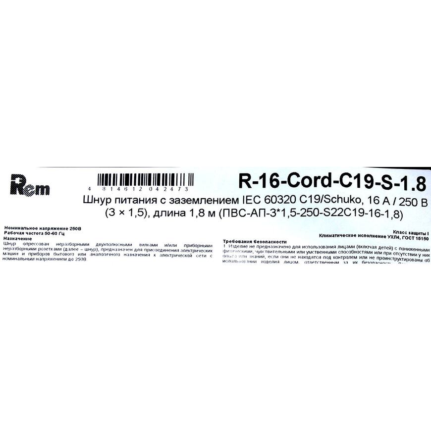 Шнур питания Rem (R-16-CORD-C19-S-1.8) C19-Schuko проводник.:3x1.5мм2 1.8м 250В 16А (упак.:1шт) черн