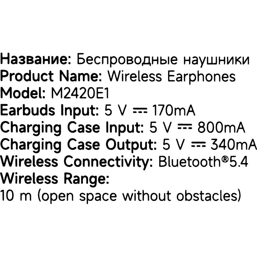 Беспроводные внутриканальные наушники; передача сигнала-Bluetooth 5.4; Степень пылевлагозащиты IP-IPX4; Мин./макс. воспроизводимая частота 20 Гц/20000 Гц; Сопротивление (импеданс)-16 Ом; Мощность-10 мВт; Тип индикатора заряда-LED; номинальный вход/выход кейса- 5В-800мА/5В-340мА