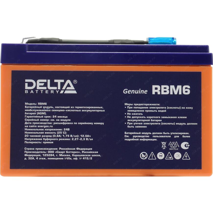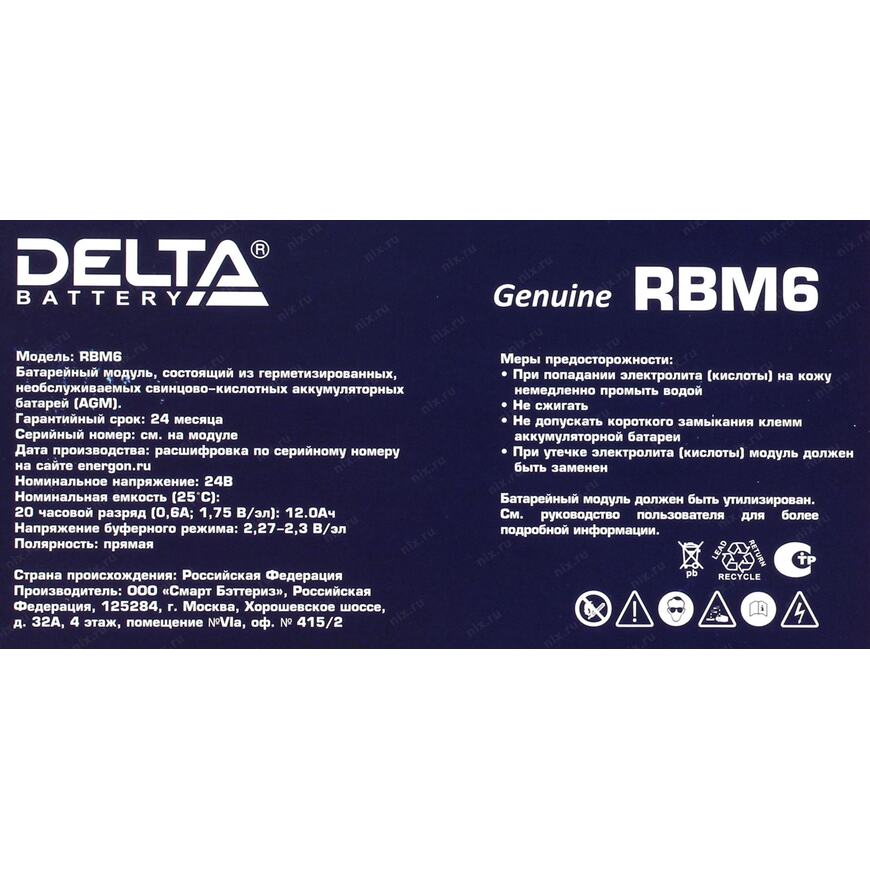 Является эквивалентом модуля RBC6. Батарейные модули Delta RBM предназначены для замены вышедшего из строя заводского картриджа в ИБП APC. Модули являются герметизированными, необслуживаемыми с системой рекомбинации газов (VRLA). Изготавливаются по технологии AGM (Absorbent Glass Mat - электролит, абсорбированный в стекловолоконном сепараторе). Аккумуляторы подобраны таким образом, чтобы гарантировать требуемое время автономии в соответствии с документацией производителя ИБП.