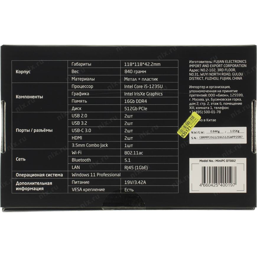 CBR MiniPC-DT002 (Intel i5-1235U /16Gb DDR4/512Gb SSD PCIe / W11Pro / 2 х USB 2.0, 2 х HDMI, 2 х USB 3.2, USB-C 3.0, USB-C 2.0, 3.5mm Combo Jack, RJ-45, VESA 75*75/100*100 )