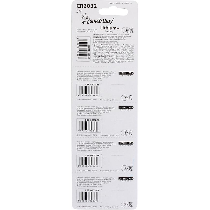 Литиевый элемент питания Smartbuy special CR2032/5B (100/4000) (SBBM-2032-5B)