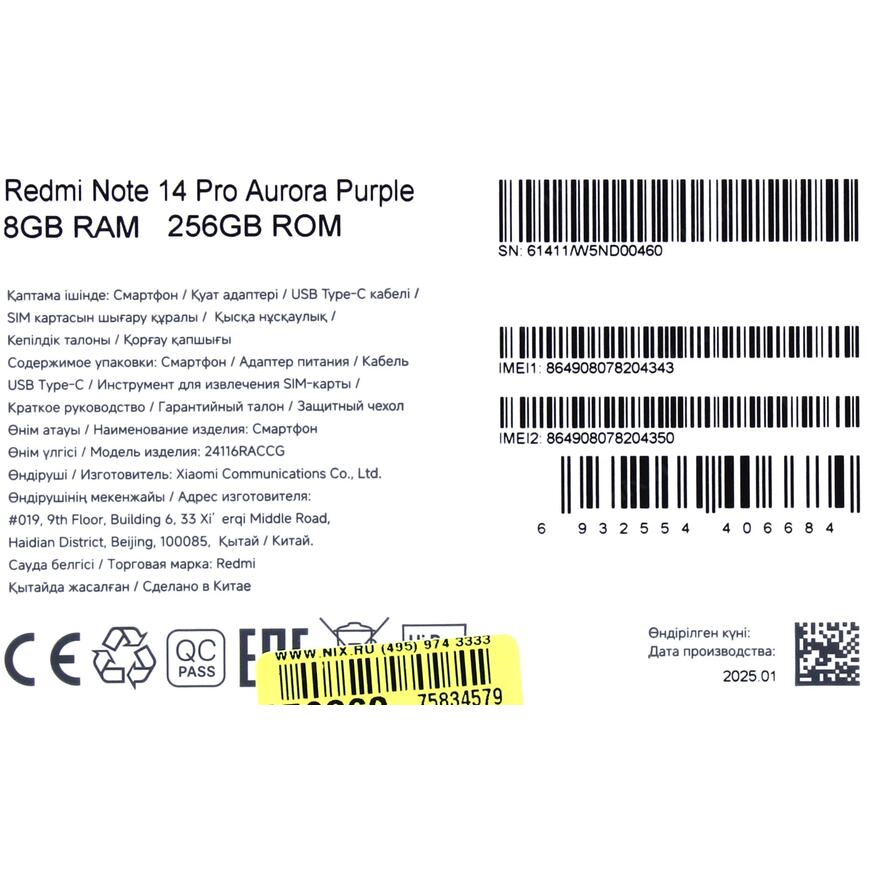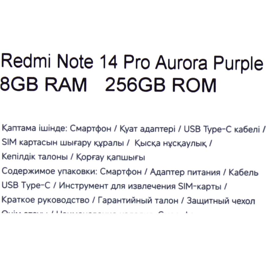 Смартфон Xiaomi Redmi Note 14 Pro RU Aurora Purple 256 Гб (6.67 дюйма, AMOLED, MediaTek Helio G100-Ultra, 2.2 ГГц, 8-ядерный, Mali-G57 MC2, 8 Гб RAM, 4G, Камера: Есть, Android 14, Пластиковый)