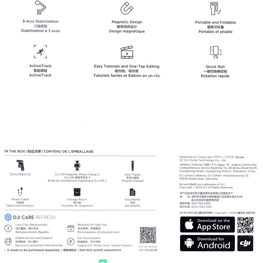 Стабилизатор для различных моделей смартфонов. Имеет емкий аккумулятор с поддержкой ускоренной зарядки. Складная конструкция и магнитное крепление смартфона. Управление со смартфона с помощью приложения DJI Mimo. Управление наклоном, креном и поворотом со скоростью до 120°/с.