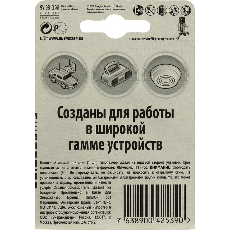 Щелочной элемент питания (батарейка) "Крона" 9V в блистере; рекомендуется использовать в устройствах со средним и высоким потреблением энергии (плееры, диктофоны, пульты ДУ, электробритвы, компьютерные мыши, весы, фотоаппараты, фотовспышки, фонари, радиостанции и прочее)