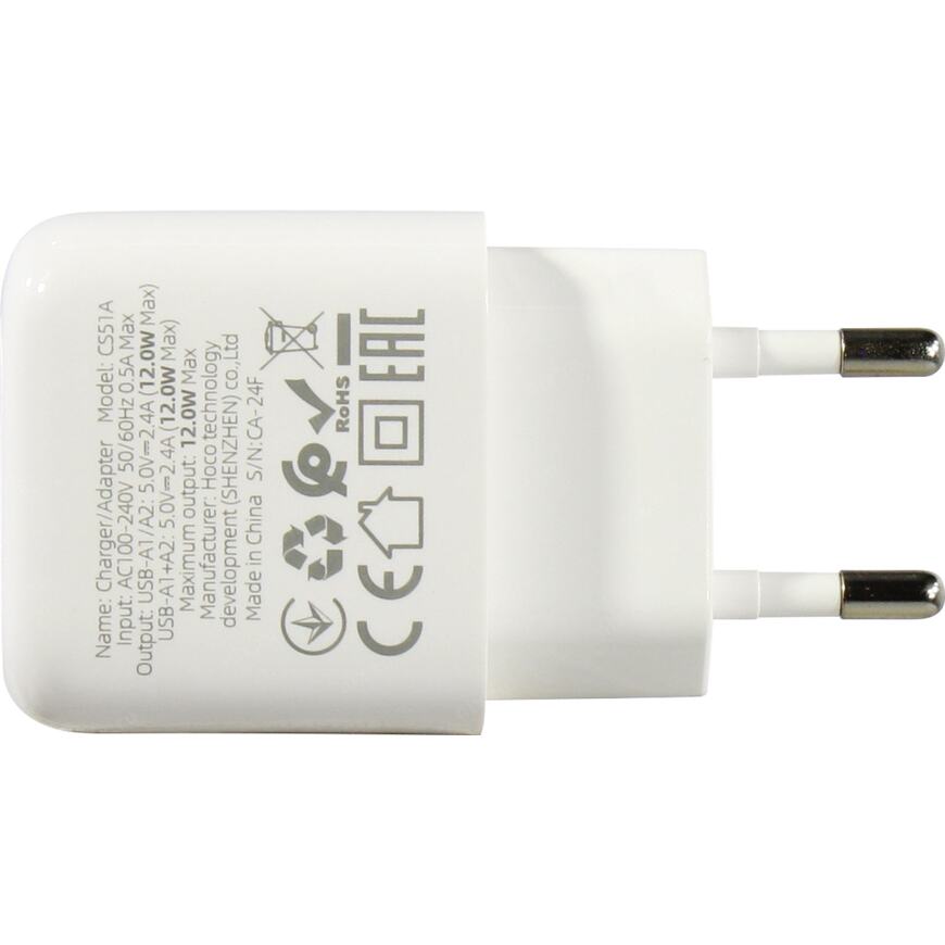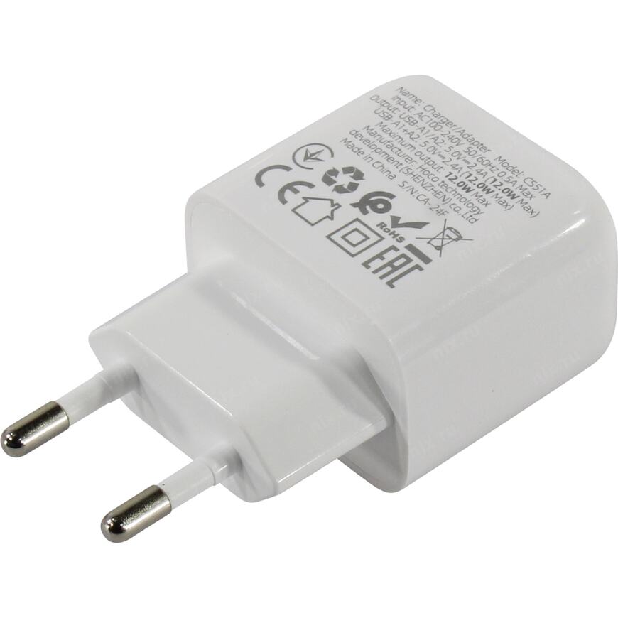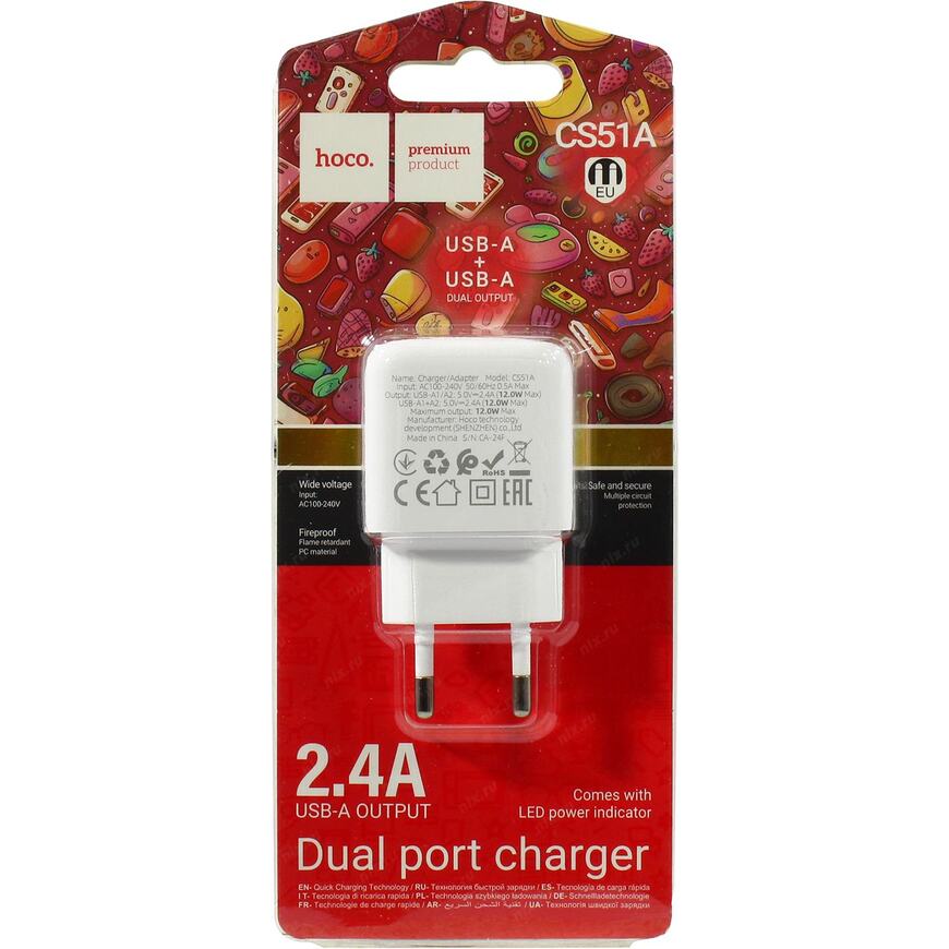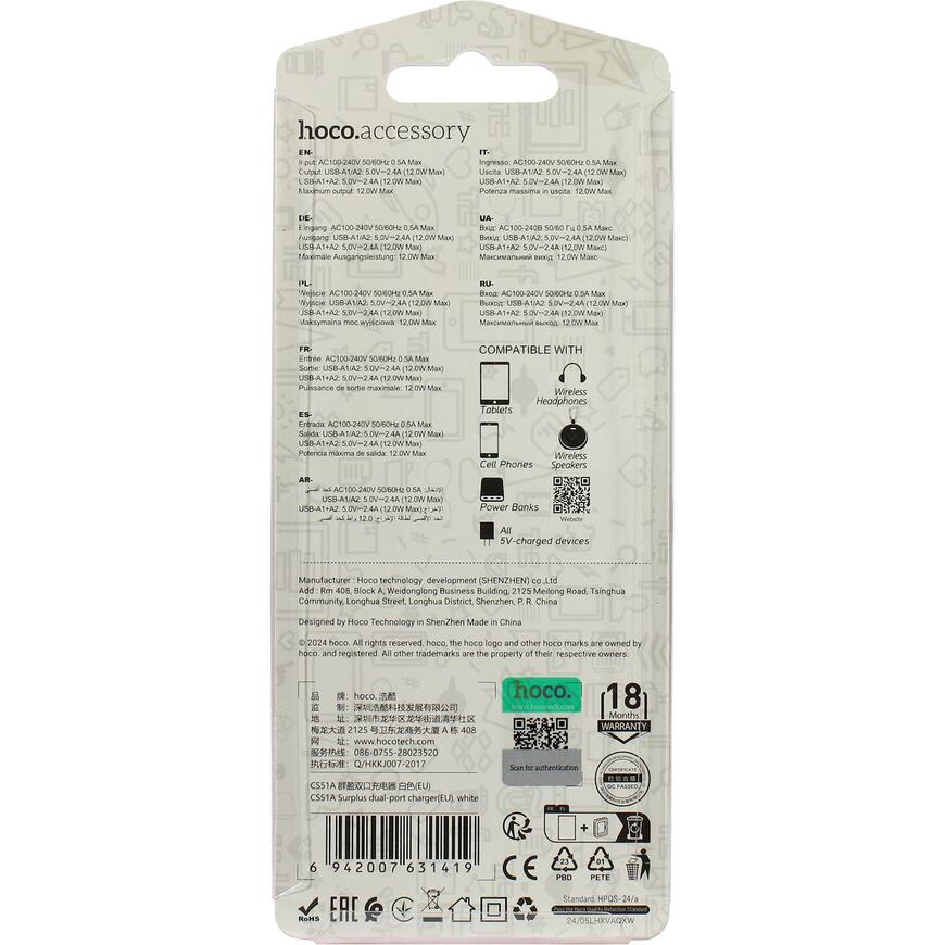 Зарядка USB-устройств от 220В HOCO CS51A Surplus White 2 x USB Type A \"мама\" (12 Вт) (5 В, 2.4А, 12 Вт, разъем 2 x USB Type A \"мама\")