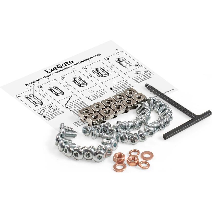 Верхняя панель - 1 шт., Саморезы М5.5x10 - 30 шт., Рама - 2 шт., Нижняя панель - 1 шт., Монтажный профиль - 4 шт., Задняя панель - 1 шт., Боковая панель - 2 шт., Передняя дверца - 1 шт., Руководство пользователя
