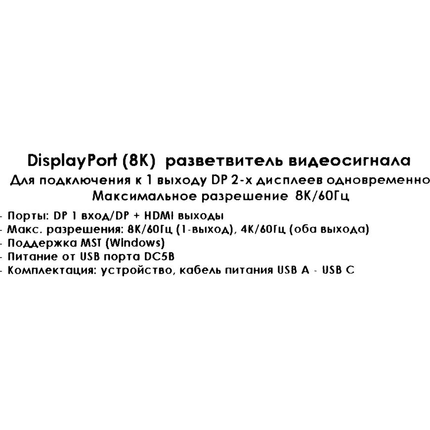 Поддерживается технология DisplayPort MST (Multi-stream transport). Разветвитель позволяет подключать до 2 мониторов к одному порту DisplayPort в зеркальном режиме SST или в режиме расширения рабочего стола MST (только под Windows)