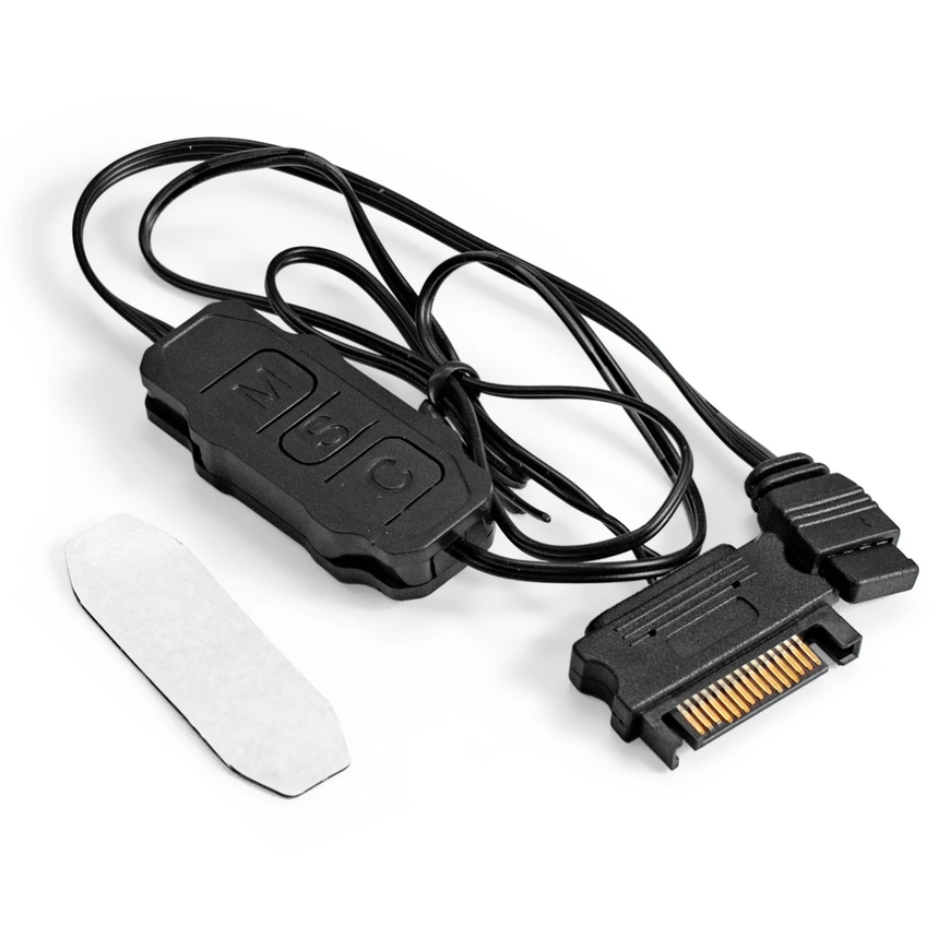 Управление 3 кнопки: М -выбор статического цвета, S - выбор яркости света в статическом режиме или скорости в динамическом (+ выключение подсветки при долгом нажатии), M - выбор динамического режима. Разъем питания: SATA Power. Длина кабеля от разъема питания до контроллера 47см, от контроллера до ARGB разъема - 15 см. Размер: 50x22x9 мм