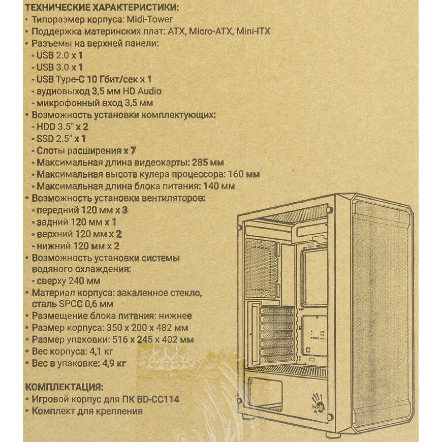 Bloody BD-CC114 Black - это баланс стиля, функциональности и качества. Его продуманная конструкция, поддержка современных компонентов и удобство сборки делают его отличным выбором для тех, кто ценит надёжность и эстетику. Закалённое стекло, удобные интерфейсы и эффективная система охлаждения превращают этот корпус в идеальную основу для мощного и красивого ПК.