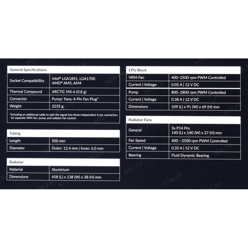 138 x 38 x 458 мм (только радиатор), 108.5 х 68.5 х 91 мм (водоблок)