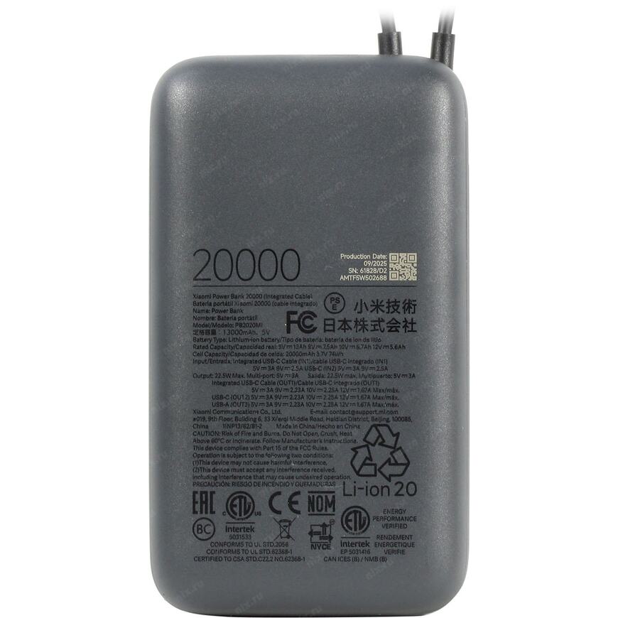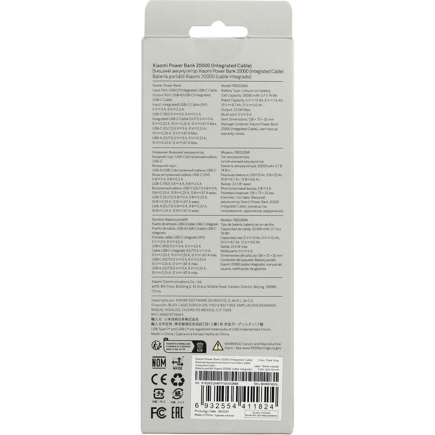 Мобильный аккумулятор Xiaomi BHR9740GL 20000mAh QC3.0/PD2.0 22.5W 3A USB-A/USB-C темно-серый
