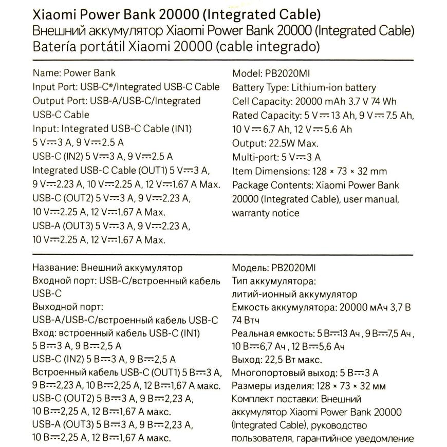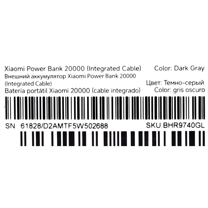Xiaomi Внешний аккумулятор с встроенным кабелем Xiaomi Power Bank 20000mAh (Integrated Cable) GL Dark Gray (BHR9740GL)