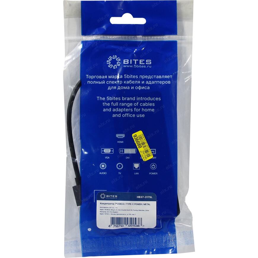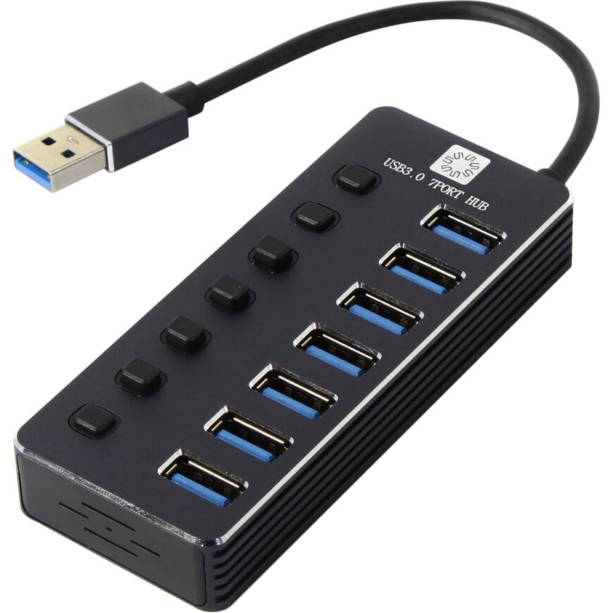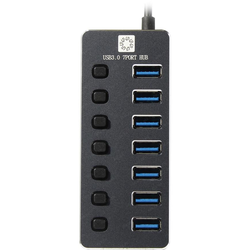 7-портовый USB 3.0 концентратор с индивидуальными выключателями для каждого USB-порта. Имеет разъем USB type C для подключения дополнительного блока питания.
