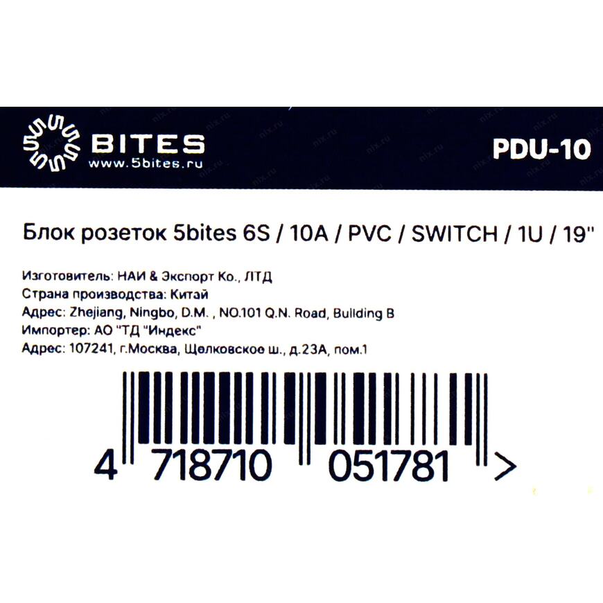 [Сетевой фильтр] 5bites Блок розеток PDU-10 6S / 10A / PVC / SWITCH / 1U / 19"