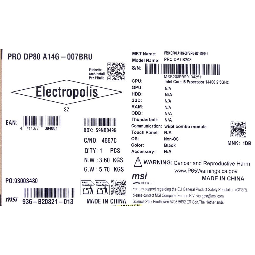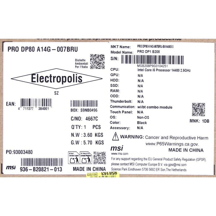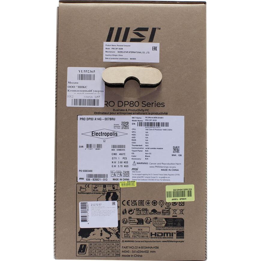 ПК Мини MSI Pro DP80 A14G-007BRU i5 14400 (2.5) UHDG 730 CR без ОС 2xGbitEth WiFi BT 300W черный (936-B20821-013)