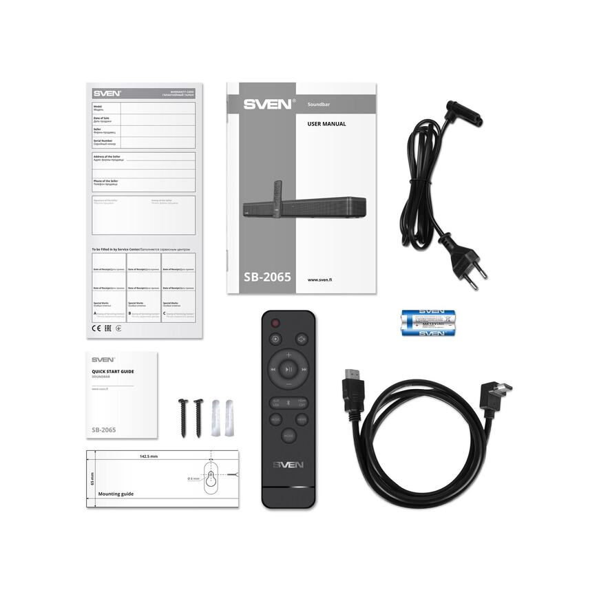 кабель питания, кабель HDMI, пульт ДУ, 2 батарейки типа AAA