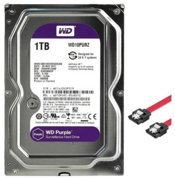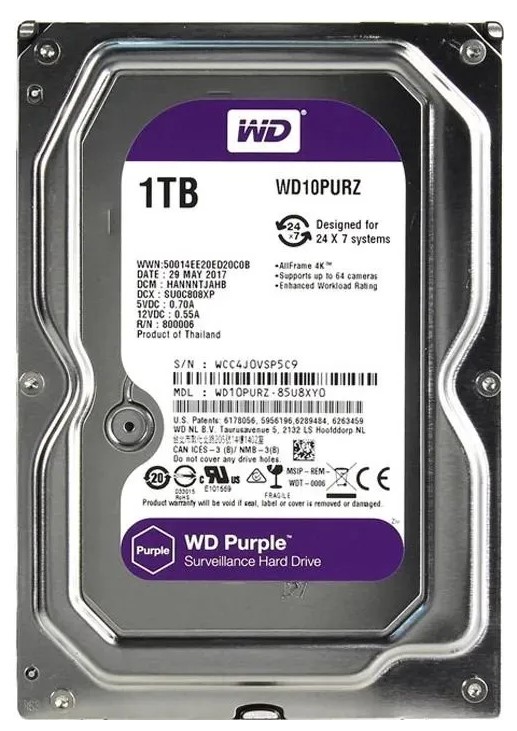 Высокую производительность WD Purple обеспечивает кэш-память на 64 МБ. Рассчитанный на подключение большого количества камер, накопитель способен при необходимости модернизировать систему безопасности. Подключается диск через SATA III при поддержке пропускной способности на ровне 6 Гбит/с. Особенность жесткого диска в том, что он может использоваться в RAID-массивах. Объем 1 ТБ позволяет сохранить на него большое количество видеозаписей.
