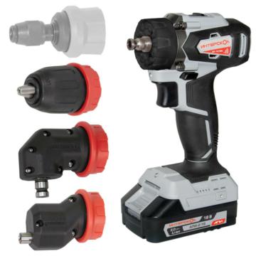 Сверлильный патрон съемный, в шпинделе гнездо ?” с магнитным креплением. Машина может работать дополнительно с тремя насадками, поставляемыми опционально – эксцентриковой, для работы вплотную в углах, угловой, а также насадкой с механическим зажимом для хвостовиков HEX ?”/