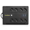 Устройство оснащено восемью выходными разъемами Schuko, что позволяет подключать несколько устройств одновременно. ИБП также оснащен четырьмя портами USB для подключения и зарядки устройств в режиме бесперебойного питания. Устройство поставляется с евровилкой с заземлением, обеспечивающей безопасность и соответствие всем европейским стандартам. Автоматический стабилизатор напряжения позволяет устройству работать в широком диапазоне напряжений без перехода на батареи. Наконец, функция холодного старта позволяет включить оборудование без подключения к электросети.
