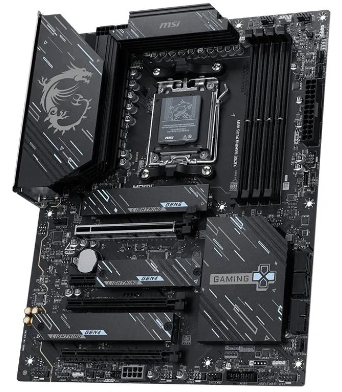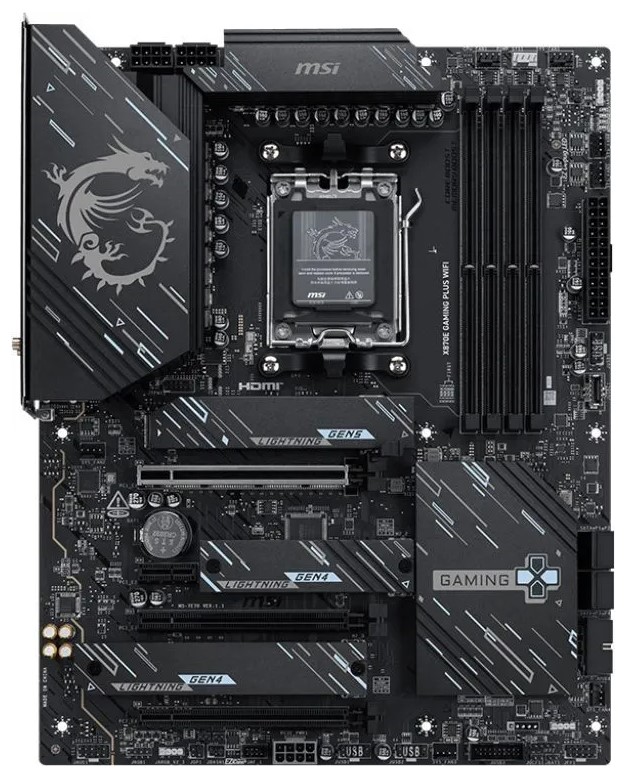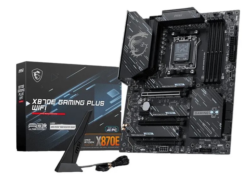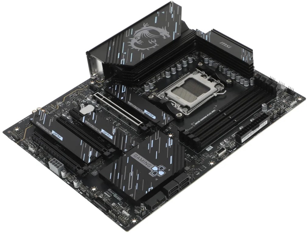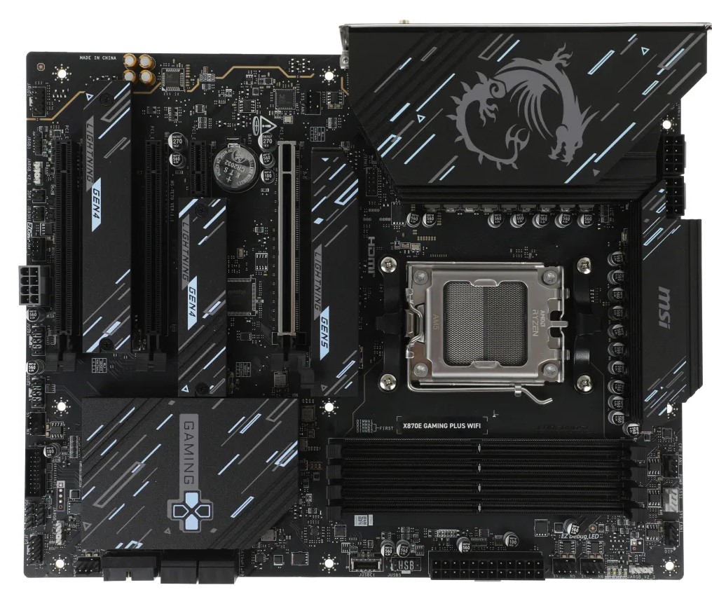 Материнская плата MSI X870E GAMING PLUS WIFI – устройство форм-фактора Standard-ATX с размерами 305x244 мм подходит для сборки мощного универсального компьютера для дома или офиса. Плата работает под управлением чипсета AMD X870E и поддерживает процессоры AMD Ryzen 7000, 8000 и 9000. Схема питания 14+2+1 гарантирует реализацию потенциала мощных игровых CPU, а подсистема памяти с поддержкой технологий разгона AMD EXPO обеспечивает стабильность работы модулей DDR5. Максимальный объем ОЗУ равен 256 ГБ.