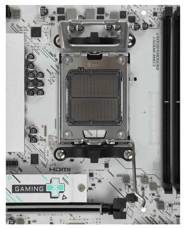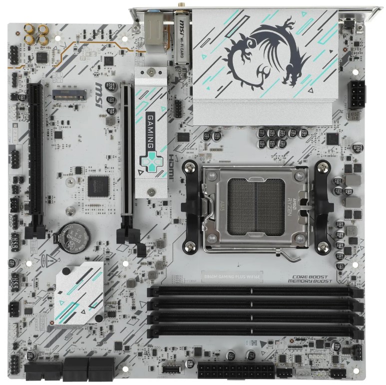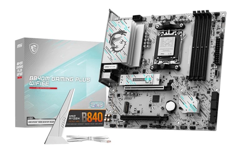 Материнская плата MSI B840M GAMING PLUS WIFI6E. Устройство форм-фактора Micro ATX с размерами 244x244 мм подходит для сборки мощного универсального компьютера для дома или офиса. Плата работает под управлением чипсета AMD B840 и поддерживает процессоры AMD Ryzen 7000, 8000 и 9000. Схема питания 7+2+1 гарантирует реализацию потенциала мощных игровых CPU, а подсистема памяти с поддержкой технологий разгона AMD EXPO обеспечивает стабильность работы производительных модулей DDR5. Максимальный объем ОЗУ равен 256 ГБ.